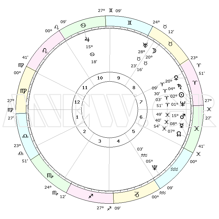 | | ΘΕΣΕΙΣ ΠΛΑΝΗΤΩΝ ΑΣΤΡΟΛΟΓΙΚΟΥ ΧΑΡΤΗ ΤΗΣ ΣΤΙΓΜΗΣ ΑΥΤΗΣ | | | | Πλανήτης | Ζώδιο | Μοίρες | Δεκαήμ. | Σε οίκο | Απόκλιση | | Ακμές των οίκων | | Ηλιος | Κριός | 01°59' | Πρώτο | 8 | 00 N 47 | | 1ος | 04°36' | Παρθένος | | Σελήνη | Ταύρος | 19°09' | Δεύτερο | 9 | 22 N 15 | | 2ος | 28°56' | Παρθένος | | Ερμής | Ιχθείς | 08°39' | Πρώτο | 7 | 07 S 48 | | 3ος | 28°00' | Ζυγός | | Αφροδίτη | Κριός | 20°03' | Τρίτο | 8 | 07 N 06 | | 4ος | 00°57' | Τοξότης | | Αρης | Ιχθείς | 15°45' | Δεύτερο | 7 | 06 S 36 | | 5ος | 04°51' | Αιγόκερως | | Δίας | Καρκίνος | 15°18' | Δεύτερο | 11 | 22 N 55 | | 6ος | 06°28' | Υδροχόος | | Κρόνος | Κριός | 04°29' | Πρώτο | 8 | 00 S 10 | | 7ος | 04°36' | Ιχθείς | | Ουρανός | Ταύρος | 28°23' | Τρίτο | 9 | 19 N 38 | | 8ος | 28°56' | Ιχθείς | | Ποσειδώνας | Κριός | 01°51' | Πρώτο | 8 | 00 S 28 | | 9ος | 28°00' | Κριός | | Πλούτωνας | Υδροχόος | 05°03' | Πρώτο | 5 | 22 S 48 | | 10ος | 00°57' | Δίδυμοι | | Β. Δεσμός | Ιχθείς | 07°54' | Πρώτο | 7 | 08 S 36 | | 11ος | 04°51' | Καρκίνος | | Ωροσκόπος | Παρθένος | 04°36' | Πρώτο | | | 12ος | 06°28' | Λέων | | Μεσουράνημα | Δίδυμοι | 00°57' | Πρώτο | | | |