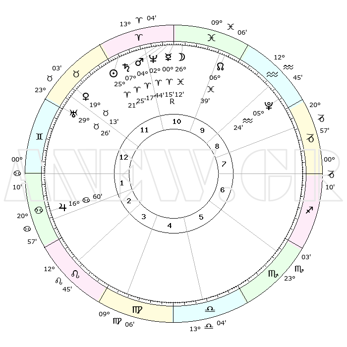 | | ΘΕΣΕΙΣ ΠΛΑΝΗΤΩΝ ΑΣΤΡΟΛΟΓΙΚΟΥ ΧΑΡΤΗ ΤΗΣ ΣΤΙΓΜΗΣ ΑΥΤΗΣ | | | | Πλανήτης | Ζώδιο | Μοίρες | Δεκαήμ. | Σε οίκο | Απόκλιση | | Ακμές των οίκων | | Ηλιος | Κριός | 25°18' | Τρίτο | 11 | 09 N 47 | | 1ος | 08°11' | Δίδυμοι | | Σελήνη | Ιχθείς | 25°21' | Τρίτο | 11 | 00 S 27 | | 2ος | 01°29' | Καρκίνος | | Ερμής | Κριός | 00°10'R | Πρώτο | 11 | 02 S 19 | | 3ος | 22°43' | Καρκίνος | | Αφροδίτη | Ταύρος | 19°08' | Δεύτερο | 12 | 17 N 41 | | 4ος | 16°10' | Λέων | | Αρης | Κριός | 04°14' | Πρώτο | 11 | 00 N 47 | | 5ος | 16°07' | Παρθένος | | Δίας | Καρκίνος | 16°60' | Δεύτερο | 2 | 22 N 44 | | 6ος | 25°39' | Ζυγός | | Κρόνος | Κριός | 07°25' | Πρώτο | 11 | 00 N 58 | | 7ος | 08°11' | Τοξότης | | Ουρανός | Ταύρος | 29°26' | Τρίτο | 12 | 19 N 52 | | 8ος | 01°29' | Αιγόκερως | | Ποσειδώνας | Κριός | 02°44' | Πρώτο | 11 | 00 S 07 | | 9ος | 22°43' | Αιγόκερως | | Πλούτωνας | Υδροχόος | 05°24' | Πρώτο | 9 | 22 S 47 | | 10ος | 16°10' | Υδροχόος | | Β. Δεσμός | Ιχθείς | 06°39' | Πρώτο | 10 | 09 S 04 | | 11ος | 16°07' | Ιχθείς | | Ωροσκόπος | Δίδυμοι | 08°11' | Πρώτο | | | 12ος | 25°39' | Κριός | | Μεσουράνημα | Υδροχόος | 16°10' | Δεύτερο | | | |