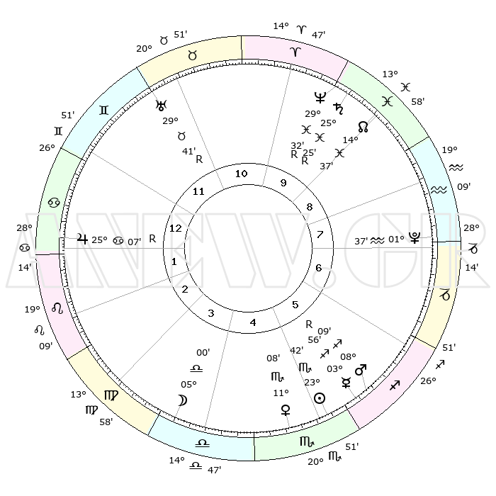 | | ΘΕΣΕΙΣ ΠΛΑΝΗΤΩΝ ΑΣΤΡΟΛΟΓΙΚΟΥ ΧΑΡΤΗ ΤΗΣ ΣΤΙΓΜΗΣ ΑΥΤΗΣ | | | | Πλανήτης | Ζώδιο | Μοίρες | Δεκαήμ. | Σε οίκο | Απόκλιση | | Ακμές των οίκων | | Ηλιος | Σκορπιός | 23°37' | Τρίτο | 5 | 18 S 40 | | 1ος | 05°12' | Καρκίνος | | Σελήνη | Ζυγός | 04°05' | Πρώτο | 4 | 03 S 04 | | 2ος | 25°45' | Καρκίνος | | Ερμής | Τοξότης | 04°00'R | Πρώτο | 6 | 21 S 56 | | 3ος | 17°56' | Λέων | | Αφροδίτη | Σκορπιός | 11°02' | Δεύτερο | 5 | 14 S 00 | | 4ος | 15°06' | Παρθένος | | Αρης | Τοξότης | 08°06' | Πρώτο | 6 | 22 S 11 | | 5ος | 19°48' | Ζυγός | | Δίας | Καρκίνος | 25°07'R | Τρίτο | 1 | 21 N 13 | | 6ος | 29°20' | Σκορπιός | | Κρόνος | Ιχθείς | 25°25'R | Τρίτο | 10 | 04 S 03 | | 7ος | 05°12' | Αιγόκερως | | Ουρανός | Ταύρος | 29°41'R | Τρίτο | 12 | 19 N 52 | | 8ος | 25°45' | Αιγόκερως | | Ποσειδώνας | Ιχθείς | 29°32'R | Τρίτο | 10 | 01 S 26 | | 9ος | 17°56' | Υδροχόος | | Πλούτωνας | Υδροχόος | 01°37' | Πρώτο | 8 | 23 S 28 | | 10ος | 15°06' | Ιχθείς | | Β. Δεσμός | Ιχθείς | 14°37' | Δεύτερο | 9 | 06 S 03 | | 11ος | 19°48' | Κριός | | Ωροσκόπος | Καρκίνος | 05°12' | Πρώτο | | | 12ος | 29°20' | Ταύρος | | Μεσουράνημα | Ιχθείς | 15°06' | Δεύτερο | | | |