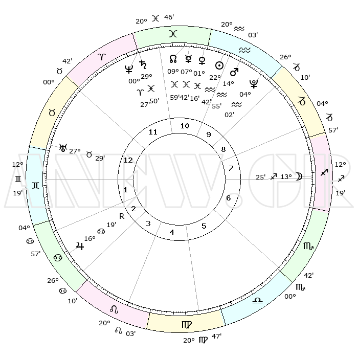 | | ΘΕΣΕΙΣ ΠΛΑΝΗΤΩΝ ΑΣΤΡΟΛΟΓΙΚΟΥ ΧΑΡΤΗ ΤΗΣ ΣΤΙΓΜΗΣ ΑΥΤΗΣ | | | | Πλανήτης | Ζώδιο | Μοίρες | Δεκαήμ. | Σε οίκο | Απόκλιση | | Ακμές των οίκων | | Ηλιος | Υδροχόος | 22°38' | Τρίτο | 11 | 13 S 58 | | 1ος | 13°30' | Ταύρος | | Σελήνη | Τοξότης | 12°37' | Δεύτερο | 8 | 27 S 30 | | 2ος | 12°07' | Δίδυμοι | | Ερμής | Ιχθείς | 07°35' | Πρώτο | 11 | 09 S 21 | | 3ος | 04°28' | Καρκίνος | | Αφροδίτη | Ιχθείς | 01°11' | Πρώτο | 11 | 12 S 25 | | 4ος | 26°23' | Καρκίνος | | Αρης | Υδροχόος | 14°52' | Δεύτερο | 10 | 17 S 24 | | 5ος | 22°20' | Λέων | | Δίας | Καρκίνος | 16°19'R | Δεύτερο | 3 | 22 N 45 | | 6ος | 27°45' | Παρθένος | | Κρόνος | Ιχθείς | 29°50' | Τρίτο | 12 | 02 S 03 | | 7ος | 13°30' | Σκορπιός | | Ουρανός | Ταύρος | 27°29' | Τρίτο | 1 | 19 N 25 | | 8ος | 12°07' | Τοξότης | | Ποσειδώνας | Κριός | 00°27' | Πρώτο | 12 | 01 S 01 | | 9ος | 04°28' | Αιγόκερως | | Πλούτωνας | Υδροχόος | 04°01' | Πρώτο | 10 | 22 S 58 | | 10ος | 26°23' | Αιγόκερως | | Β. Δεσμός | Ιχθείς | 09°59' | Πρώτο | 11 | 07 S 50 | | 11ος | 22°20' | Υδροχόος | | Ωροσκόπος | Ταύρος | 13°30' | Δεύτερο | | | 12ος | 27°45' | Ιχθείς | | Μεσουράνημα | Αιγόκερως | 26°23' | Τρίτο | | | |