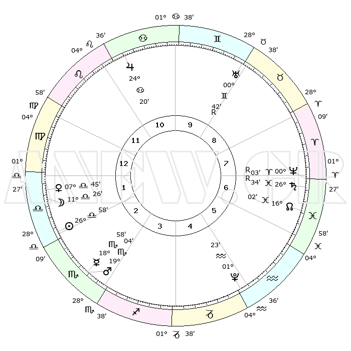 | ΘΕΣΕΙΣ ΠΛΑΝΗΤΩΝ ΑΣΤΡΟΛΟΓΙΚΟΥ ΧΑΡΤΗ ΤΗΣ ΣΤΙΓΜΗΣ ΑΥΤΗΣ | | Πλανήτης | Ζώδιο | Μοίρες | Δεκαήμ. | Σε οίκο | Απόκλιση | | Ακμές των οίκων | Ηλιος | Ζυγός | 26°50' | Τρίτο | 3 | 10 S 20 | | 1ος | 22°36' | Λέων | Σελήνη | Ζυγός | 09°50' | Πρώτο | 2 | 05 S 40 | | 2ος | 15°40' | Παρθένος | Ερμής | Σκορπιός | 18°48' | Δεύτερο | 4 | 19 S 33 | | 3ος | 13°36' | Ζυγός | Αφροδίτη | Ζυγός | 07°35' | Πρώτο | 2 | 01 S 36 | | 4ος | 16°22' | Σκορπιός | Αρης | Σκορπιός | 18°59' | Δεύτερο | 4 | 17 S 43 | | 5ος | 21°05' | Τοξότης | Δίας | Καρκίνος | 24°19' | Τρίτο | 12 | 21 N 18 | | 6ος | 23°42' | Αιγόκερως | Κρόνος | Ιχθείς | 26°34'R | Τρίτο | 8 | 03 S 39 | | 7ος | 22°36' | Υδροχόος | Ουρανός | Δίδυμοι | 00°42'R | Πρώτο | 10 | 20 N 05 | | 8ος | 15°40' | Ιχθείς | Ποσειδώνας | Κριός | 00°03'R | Πρώτο | 8 | 01 S 14 | | 9ος | 13°36' | Κριός | Πλούτωνας | Υδροχόος | 01°22' | Πρώτο | 6 | 23 S 32 | | 10ος | 16°22' | Ταύρος | Β. Δεσμός | Ιχθείς | 16°02' | Δεύτερο | 8 | 05 S 30 | | 11ος | 21°05' | Δίδυμοι | Ωροσκόπος | Λέων | 22°36' | Τρίτο | | | 12ος | 23°42' | Καρκίνος | Μεσουράνημα | Ταύρος | 16°22' | Δεύτερο | | | |