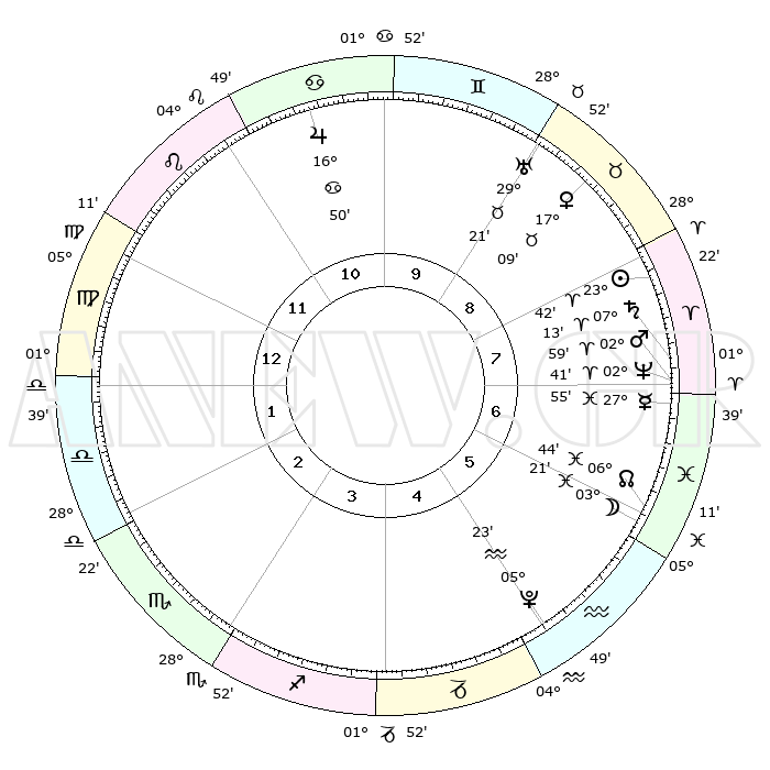 | | ΘΕΣΕΙΣ ΠΛΑΝΗΤΩΝ ΑΣΤΡΟΛΟΓΙΚΟΥ ΧΑΡΤΗ ΤΗΣ ΣΤΙΓΜΗΣ ΑΥΤΗΣ | | | | Πλανήτης | Ζώδιο | Μοίρες | Δεκαήμ. | Σε οίκο | Απόκλιση | | Ακμές των οίκων | | Ηλιος | Κριός | 23°36' | Τρίτο | 8 | 09 N 10 | | 1ος | 01°04' | Παρθένος | | Σελήνη | Ιχθείς | 01°59' | Πρώτο | 7 | 11 S 17 | | 2ος | 25°02' | Παρθένος | | Ερμής | Ιχθείς | 27°47' | Τρίτο | 8 | 03 S 13 | | 3ος | 23°48' | Ζυγός | | Αφροδίτη | Ταύρος | 17°02' | Δεύτερο | 9 | 17 N 01 | | 4ος | 26°43' | Σκορπιός | | Αρης | Κριός | 02°54' | Πρώτο | 8 | 00 N 15 | | 5ος | 00°51' | Αιγόκερως | | Δίας | Καρκίνος | 16°49' | Δεύτερο | 11 | 22 N 45 | | 6ος | 02°43' | Υδροχόος | | Κρόνος | Κριός | 07°12' | Πρώτο | 8 | 00 N 53 | | 7ος | 01°04' | Ιχθείς | | Ουρανός | Ταύρος | 29°21' | Τρίτο | 10 | 19 N 51 | | 8ος | 25°02' | Ιχθείς | | Ποσειδώνας | Κριός | 02°40' | Πρώτο | 8 | 00 S 09 | | 9ος | 23°48' | Κριός | | Πλούτωνας | Υδροχόος | 05°23' | Πρώτο | 6 | 22 S 47 | | 10ος | 26°44' | Ταύρος | | Β. Δεσμός | Ιχθείς | 06°44' | Πρώτο | 7 | 09 S 02 | | 11ος | 00°51' | Καρκίνος | | Ωροσκόπος | Παρθένος | 01°04' | Πρώτο | | | 12ος | 02°43' | Λέων | | Μεσουράνημα | Ταύρος | 26°44' | Τρίτο | | | |