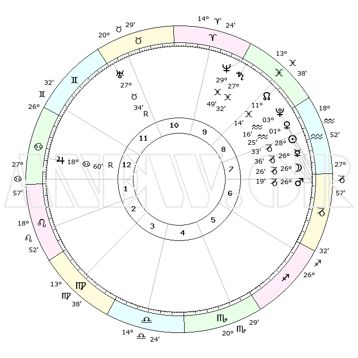 | | ΘΕΣΕΙΣ ΠΛΑΝΗΤΩΝ ΑΣΤΡΟΛΟΓΙΚΟΥ ΧΑΡΤΗ ΤΗΣ ΣΤΙΓΜΗΣ ΑΥΤΗΣ | | | | Πλανήτης | Ζώδιο | Μοίρες | Δεκαήμ. | Σε οίκο | Απόκλιση | | Ακμές των οίκων | | Ηλιος | Αιγόκερως | 28°29' | Τρίτο | 8 | 20 S 28 | | 1ος | 07°60' | Καρκίνος | | Σελήνη | Αιγόκερως | 25°36' | Τρίτο | 7 | 24 S 32 | | 2ος | 28°28' | Καρκίνος | | Ερμής | Αιγόκερως | 26°30' | Τρίτο | 7 | 22 S 46 | | 3ος | 20°53' | Λέων | | Αφροδίτη | Υδροχόος | 01°20' | Πρώτο | 8 | 20 S 55 | | 4ος | 18°31' | Παρθένος | | Αρης | Αιγόκερως | 26°16' | Τρίτο | 7 | 21 S 52 | | 5ος | 23°35' | Ζυγός | | Δίας | Καρκίνος | 19°00'R | Δεύτερο | 1 | 22 N 22 | | 6ος | 02°47' | Τοξότης | | Κρόνος | Ιχθείς | 27°32' | Τρίτο | 10 | 03 S 00 | | 7ος | 07°60' | Αιγόκερως | | Ουρανός | Ταύρος | 27°34'R | Τρίτο | 11 | 19 N 26 | | 8ος | 28°28' | Αιγόκερως | | Ποσειδώνας | Ιχθείς | 29°49' | Τρίτο | 10 | 01 S 17 | | 9ος | 20°53' | Υδροχόος | | Πλούτωνας | Υδροχόος | 03°16' | Πρώτο | 8 | 23 S 06 | | 10ος | 18°31' | Ιχθείς | | Β. Δεσμός | Ιχθείς | 11°14' | Δεύτερο | 9 | 07 S 21 | | 11ος | 23°35' | Κριός | | Ωροσκόπος | Καρκίνος | 07°60' | Πρώτο | | | 12ος | 02°47' | Δίδυμοι | | Μεσουράνημα | Ιχθείς | 18°31' | Δεύτερο | | | |