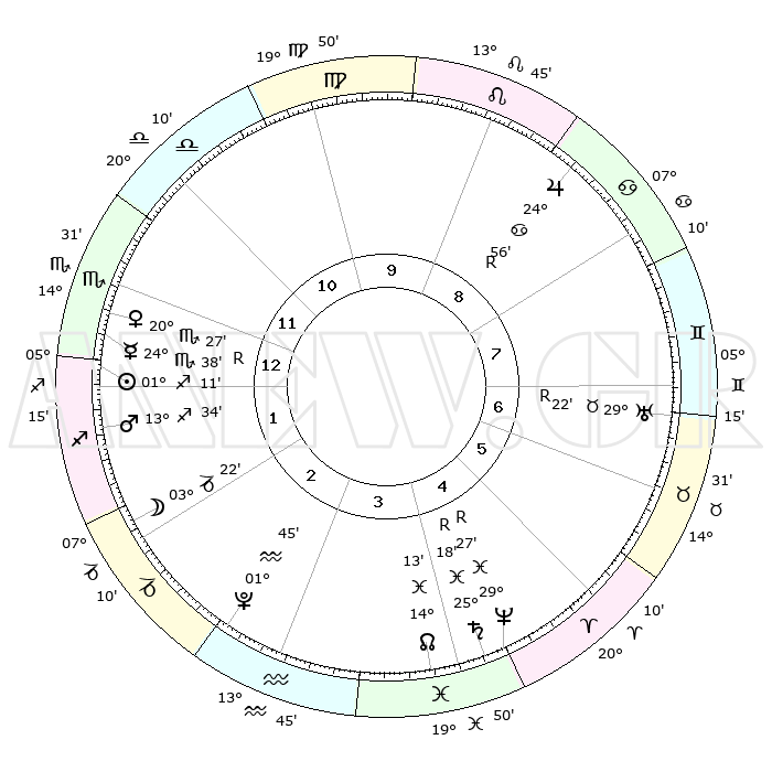 | | ΘΕΣΕΙΣ ΠΛΑΝΗΤΩΝ ΑΣΤΡΟΛΟΓΙΚΟΥ ΧΑΡΤΗ ΤΗΣ ΣΤΙΓΜΗΣ ΑΥΤΗΣ | | | | Πλανήτης | Ζώδιο | Μοίρες | Δεκαήμ. | Σε οίκο | Απόκλιση | | Ακμές των οίκων | | Ηλιος | Τοξότης | 01°07' | Πρώτο | 1 | 20 S 23 | | 1ος | 17°26' | Σκορπιός | | Σελήνη | Αιγόκερως | 02°38' | Πρώτο | 2 | 28 S 10 | | 2ος | 17°08' | Τοξότης | | Ερμής | Σκορπιός | 24°43'R | Τρίτο | 1 | 17 S 34 | | 3ος | 20°56' | Αιγόκερως | | Αφροδίτη | Σκορπιός | 20°22' | Τρίτο | 1 | 16 S 54 | | 4ος | 26°22' | Υδροχόος | | Αρης | Τοξότης | 13°32' | Δεύτερο | 1 | 23 S 01 | | 5ος | 28°38' | Ιχθείς | | Δίας | Καρκίνος | 24°56'R | Τρίτο | 9 | 21 N 16 | | 6ος | 25°22' | Κριός | | Κρόνος | Ιχθείς | 25°18'R | Τρίτο | 4 | 04 S 04 | | 7ος | 17°26' | Ταύρος | | Ουρανός | Ταύρος | 29°22'R | Τρίτο | 7 | 19 N 48 | | 8ος | 17°08' | Δίδυμοι | | Ποσειδώνας | Ιχθείς | 29°27'R | Τρίτο | 5 | 01 S 28 | | 9ος | 20°56' | Καρκίνος | | Πλούτωνας | Υδροχόος | 01°45' | Πρώτο | 3 | 23 S 26 | | 10ος | 26°22' | Λέων | | Β. Δεσμός | Ιχθείς | 14°14' | Δεύτερο | 4 | 06 S 12 | | 11ος | 28°38' | Παρθένος | | Ωροσκόπος | Σκορπιός | 17°26' | Δεύτερο | | | 12ος | 25°22' | Ζυγός | | Μεσουράνημα | Λέων | 26°22' | Τρίτο | | | |
