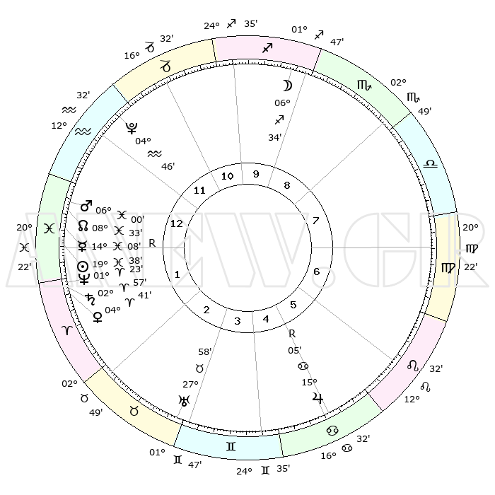 | | ΘΕΣΕΙΣ ΠΛΑΝΗΤΩΝ ΑΣΤΡΟΛΟΓΙΚΟΥ ΧΑΡΤΗ ΤΗΣ ΣΤΙΓΜΗΣ ΑΥΤΗΣ | | | | Πλανήτης | Ζώδιο | Μοίρες | Δεκαήμ. | Σε οίκο | Απόκλιση | | Ακμές των οίκων | | Ηλιος | Ιχθείς | 19°34' | Δεύτερο | 1 | 04 S 08 | | 1ος | 16°24' | Υδροχόος | | Σελήνη | Τοξότης | 05°50' | Πρώτο | 10 | 26 S 27 | | 2ος | 02°09' | Κριός | | Ερμής | Ιχθείς | 14°11'R | Δεύτερο | 1 | 03 S 07 | | 3ος | 07°35' | Ταύρος | | Αφροδίτη | Κριός | 04°36' | Πρώτο | 2 | 00 N 45 | | 4ος | 03°33' | Δίδυμοι | | Αρης | Ιχθείς | 05°57' | Πρώτο | 1 | 10 S 20 | | 5ος | 25°28' | Δίδυμοι | | Δίας | Καρκίνος | 15°05'R | Δεύτερο | 5 | 22 N 56 | | 6ος | 17°49' | Καρκίνος | | Κρόνος | Κριός | 02°57' | Πρώτο | 2 | 00 S 47 | | 7ος | 16°24' | Λέων | | Ουρανός | Ταύρος | 27°58' | Τρίτο | 3 | 19 N 32 | | 8ος | 02°09' | Ζυγός | | Ποσειδώνας | Κριός | 01°23' | Πρώτο | 1 | 00 S 39 | | 9ος | 07°35' | Σκορπιός | | Πλούτωνας | Υδροχόος | 04°46' | Πρώτο | 12 | 22 S 50 | | 10ος | 03°33' | Τοξότης | | Β. Δεσμός | Ιχθείς | 08°34' | Πρώτο | 1 | 08 S 21 | | 11ος | 25°28' | Τοξότης | | Ωροσκόπος | Υδροχόος | 16°24' | Δεύτερο | | | 12ος | 17°49' | Αιγόκερως | | Μεσουράνημα | Τοξότης | 03°33' | Πρώτο | | | |