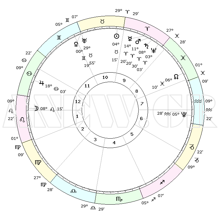 | | ΘΕΣΕΙΣ ΠΛΑΝΗΤΩΝ ΑΣΤΡΟΛΟΓΙΚΟΥ ΧΑΡΤΗ ΤΗΣ ΣΤΙΓΜΗΣ ΑΥΤΗΣ | | | | Πλανήτης | Ζώδιο | Μοίρες | Δεκαήμ. | Σε οίκο | Απόκλιση | | Ακμές των οίκων | | Ηλιος | Ταύρος | 04°11' | Πρώτο | 10 | 12 N 55 | | 1ος | 20°51' | Καρκίνος | | Σελήνη | Λέων | 07°23' | Πρώτο | 1 | 20 N 53 | | 2ος | 11°25' | Λέων | | Ερμής | Κριός | 14°13' | Δεύτερο | 10 | 03 N 20 | | 3ος | 05°16' | Παρθένος | | Αφροδίτη | Δίδυμοι | 00°14' | Πρώτο | 11 | 20 N 47 | | 4ος | 05°01' | Ζυγός | | Αρης | Κριός | 11°17' | Δεύτερο | 10 | 03 N 36 | | 5ος | 11°02' | Σκορπιός | | Δίας | Καρκίνος | 18°02' | Δεύτερο | 12 | 22 N 36 | | 6ος | 18°17' | Τοξότης | | Κρόνος | Κριός | 08°30' | Πρώτο | 10 | 01 N 23 | | 7ος | 20°51' | Αιγόκερως | | Ουρανός | Ταύρος | 29°55' | Τρίτο | 11 | 19 N 58 | | 8ος | 11°25' | Υδροχόος | | Ποσειδώνας | Κριός | 03°03' | Πρώτο | 9 | 00 N 00 | | 9ος | 05°16' | Ιχθείς | | Πλούτωνας | Υδροχόος | 05°28' | Πρώτο | 7 | 22 S 48 | | 10ος | 05°01' | Κριός | | Β. Δεσμός | Ιχθείς | 06°10' | Πρώτο | 9 | 09 S 15 | | 11ος | 11°02' | Ταύρος | | Ωροσκόπος | Καρκίνος | 20°51' | Τρίτο | | | 12ος | 18°17' | Δίδυμοι | | Μεσουράνημα | Κριός | 05°01' | Πρώτο | | | |