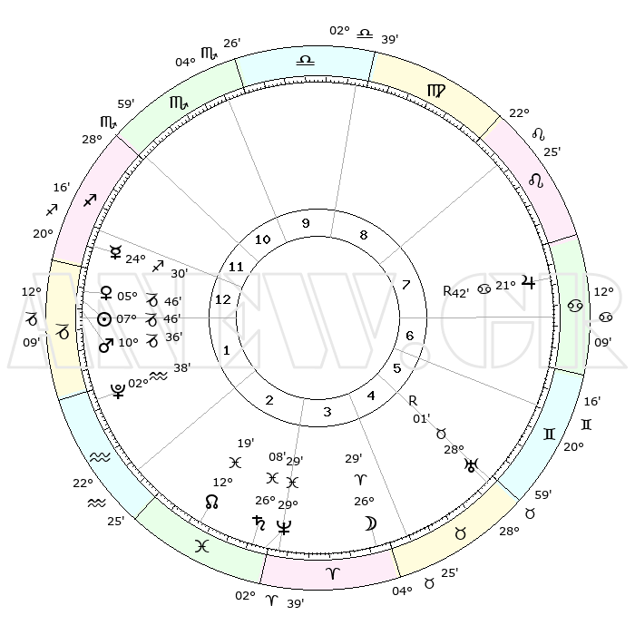 | | ΘΕΣΕΙΣ ΠΛΑΝΗΤΩΝ ΑΣΤΡΟΛΟΓΙΚΟΥ ΧΑΡΤΗ ΤΗΣ ΣΤΙΓΜΗΣ ΑΥΤΗΣ | | | | Πλανήτης | Ζώδιο | Μοίρες | Δεκαήμ. | Σε οίκο | Απόκλιση | | Ακμές των οίκων | | Ηλιος | Αιγόκερως | 07°42' | Πρώτο | 1 | 23 S 13 | | 1ος | 17°43' | Τοξότης | | Σελήνη | Κριός | 25°27' | Τρίτο | 4 | 13 N 08 | | 2ος | 21°58' | Αιγόκερως | | Ερμής | Τοξότης | 24°23' | Τρίτο | 1 | 23 S 34 | | 3ος | 00°35' | Ιχθείς | | Αφροδίτη | Αιγόκερως | 05°40' | Πρώτο | 1 | 23 S 43 | | 4ος | 06°05' | Κριός | | Αρης | Αιγόκερως | 10°32' | Δεύτερο | 1 | 23 S 53 | | 5ος | 04°27' | Ταύρος | | Δίας | Καρκίνος | 21°43'R | Τρίτο | 7 | 21 N 55 | | 6ος | 27°18' | Ταύρος | | Κρόνος | Ιχθείς | 26°08' | Τρίτο | 3 | 03 S 37 | | 7ος | 17°43' | Δίδυμοι | | Ουρανός | Ταύρος | 28°01'R | Τρίτο | 6 | 19 N 31 | | 8ος | 21°58' | Καρκίνος | | Ποσειδώνας | Ιχθείς | 29°29' | Τρίτο | 3 | 01 S 26 | | 9ος | 00°35' | Παρθένος | | Πλούτωνας | Υδροχόος | 02°38' | Πρώτο | 2 | 23 S 14 | | 10ος | 06°05' | Ζυγός | | Β. Δεσμός | Ιχθείς | 12°19' | Δεύτερο | 3 | 06 S 56 | | 11ος | 04°27' | Σκορπιός | | Ωροσκόπος | Τοξότης | 17°43' | Δεύτερο | | | 12ος | 27°18' | Σκορπιός | | Μεσουράνημα | Ζυγός | 06°05' | Πρώτο | | | |