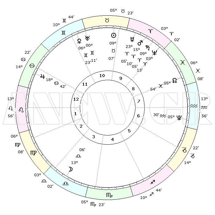 | | ΘΕΣΕΙΣ ΠΛΑΝΗΤΩΝ ΑΣΤΡΟΛΟΓΙΚΟΥ ΧΑΡΤΗ ΤΗΣ ΣΤΙΓΜΗΣ ΑΥΤΗΣ | | | | Πλανήτης | Ζώδιο | Μοίρες | Δεκαήμ. | Σε οίκο | Απόκλιση | | Ακμές των οίκων | | Ηλιος | Ταύρος | 09°04' | Πρώτο | 10 | 14 N 31 | | 1ος | 29°36' | Καρκίνος | | Σελήνη | Ζυγός | 12°29' | Δεύτερο | 3 | 07 S 38 | | 2ος | 20°37' | Λέων | | Ερμής | Κριός | 22°59' | Τρίτο | 10 | 07 N 00 | | 3ος | 15°37' | Παρθένος | | Αφροδίτη | Δίδυμοι | 06°20' | Πρώτο | 11 | 22 N 10 | | 4ος | 16°36' | Ζυγός | | Αρης | Κριός | 15°08' | Δεύτερο | 9 | 05 N 08 | | 5ος | 22°39' | Σκορπιός | | Δίας | Καρκίνος | 18°42' | Δεύτερο | 12 | 22 N 31 | | 6ος | 28°25' | Τοξότης | | Κρόνος | Κριός | 09°05' | Πρώτο | 9 | 01 N 36 | | 7ος | 29°36' | Αιγόκερως | | Ουρανός | Δίδυμοι | 00°11' | Πρώτο | 11 | 20 N 01 | | 8ος | 20°37' | Υδροχόος | | Ποσειδώνας | Κριός | 03°13' | Πρώτο | 9 | 00 N 04 | | 9ος | 15°37' | Ιχθείς | | Πλούτωνας | Υδροχόος | 05°30' | Πρώτο | 7 | 22 S 49 | | 10ος | 16°36' | Κριός | | Β. Δεσμός | Ιχθείς | 05°54' | Πρώτο | 8 | 09 S 21 | | 11ος | 22°39' | Ταύρος | | Ωροσκόπος | Καρκίνος | 29°36' | Τρίτο | | | 12ος | 28°25' | Δίδυμοι | | Μεσουράνημα | Κριός | 16°36' | Δεύτερο | | | |