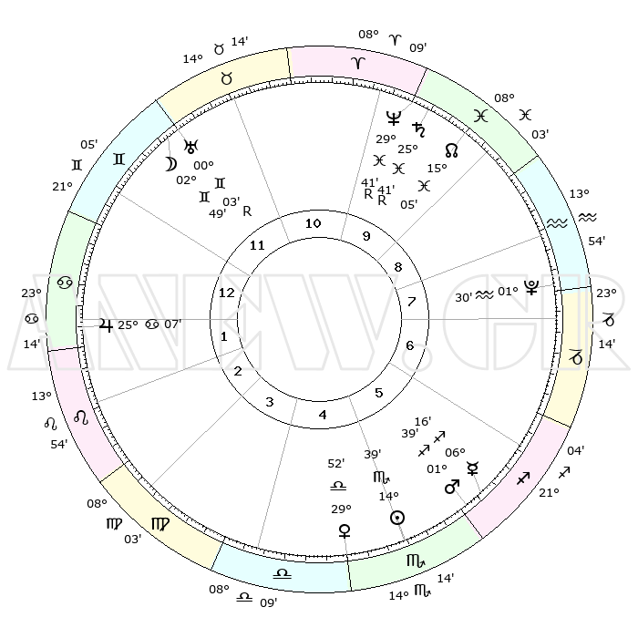 | | ΘΕΣΕΙΣ ΠΛΑΝΗΤΩΝ ΑΣΤΡΟΛΟΓΙΚΟΥ ΧΑΡΤΗ ΤΗΣ ΣΤΙΓΜΗΣ ΑΥΤΗΣ | | | | Πλανήτης | Ζώδιο | Μοίρες | Δεκαήμ. | Σε οίκο | Απόκλιση | | Ακμές των οίκων | | Ηλιος | Σκορπιός | 14°35' | Δεύτερο | 5 | 16 S 12 | | 1ος | 29°27' | Δίδυμοι | | Σελήνη | Δίδυμοι | 01°39' | Πρώτο | 12 | 25 N 17 | | 2ος | 20°17' | Καρκίνος | | Ερμής | Τοξότης | 06°14' | Πρώτο | 6 | 24 S 00 | | 3ος | 12°03' | Λέων | | Αφροδίτη | Ζυγός | 29°46' | Τρίτο | 5 | 10 S 05 | | 4ος | 08°16' | Παρθένος | | Αρης | Τοξότης | 01°36' | Πρώτο | 6 | 20 S 55 | | 5ος | 12°07' | Ζυγός | | Δίας | Καρκίνος | 25°07' | Τρίτο | 2 | 21 N 12 | | 6ος | 22°10' | Σκορπιός | | Κρόνος | Ιχθείς | 25°41'R | Τρίτο | 10 | 03 S 58 | | 7ος | 29°27' | Τοξότης | | Ουρανός | Δίδυμοι | 00°03'R | Πρώτο | 12 | 19 N 57 | | 8ος | 20°17' | Αιγόκερως | | Ποσειδώνας | Ιχθείς | 29°41'R | Τρίτο | 10 | 01 S 23 | | 9ος | 12°03' | Υδροχόος | | Πλούτωνας | Υδροχόος | 01°30' | Πρώτο | 8 | 23 S 30 | | 10ος | 08°16' | Ιχθείς | | Β. Δεσμός | Ιχθείς | 15°06' | Δεύτερο | 10 | 05 S 52 | | 11ος | 12°07' | Κριός | | Ωροσκόπος | Δίδυμοι | 29°27' | Τρίτο | | | 12ος | 22°10' | Ταύρος | | Μεσουράνημα | Ιχθείς | 08°16' | Πρώτο | | | |