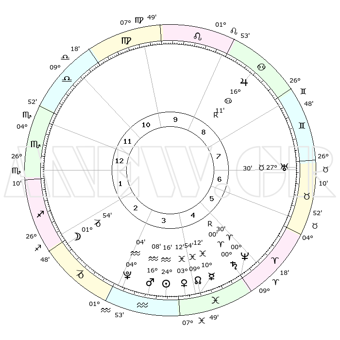 | | ΘΕΣΕΙΣ ΠΛΑΝΗΤΩΝ ΑΣΤΡΟΛΟΓΙΚΟΥ ΧΑΡΤΗ ΤΗΣ ΣΤΙΓΜΗΣ ΑΥΤΗΣ | | | | Πλανήτης | Ζώδιο | Μοίρες | Δεκαήμ. | Σε οίκο | Απόκλιση | | Ακμές των οίκων | | Ηλιος | Υδροχόος | 24°11' | Τρίτο | 4 | 13 S 27 | | 1ος | 03°50' | Σκορπιός | | Σελήνη | Αιγόκερως | 00°58' | Πρώτο | 2 | 28 S 19 | | 2ος | 02°29' | Τοξότης | | Ερμής | Ιχθείς | 10°04' | Δεύτερο | 4 | 08 S 09 | | 3ος | 04°46' | Αιγόκερως | | Αφροδίτη | Ιχθείς | 03°07' | Πρώτο | 4 | 11 S 44 | | 4ος | 09°13' | Υδροχόος | | Αρης | Υδροχόος | 16°05' | Δεύτερο | 4 | 17 S 02 | | 5ος | 12°05' | Ιχθείς | | Δίας | Καρκίνος | 16°12'R | Δεύτερο | 9 | 22 N 46 | | 6ος | 10°23' | Κριός | | Κρόνος | Ιχθείς | 29°60' | Τρίτο | 5 | 01 S 59 | | 7ος | 03°50' | Ταύρος | | Ουρανός | Ταύρος | 27°30' | Τρίτο | 7 | 19 N 25 | | 8ος | 02°29' | Δίδυμοι | | Ποσειδώνας | Κριός | 00°30' | Πρώτο | 5 | 01 S 00 | | 9ος | 04°46' | Καρκίνος | | Πλούτωνας | Υδροχόος | 04°04' | Πρώτο | 3 | 22 S 57 | | 10ος | 09°13' | Λέων | | Β. Δεσμός | Ιχθείς | 09°54' | Πρώτο | 4 | 07 S 51 | | 11ος | 12°05' | Παρθένος | | Ωροσκόπος | Σκορπιός | 03°50' | Πρώτο | | | 12ος | 10°23' | Ζυγός | | Μεσουράνημα | Λέων | 09°13' | Πρώτο | | | |