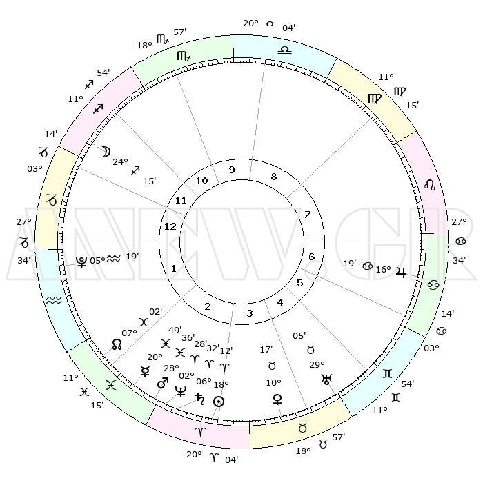 | | ΘΕΣΕΙΣ ΠΛΑΝΗΤΩΝ ΑΣΤΡΟΛΟΓΙΚΟΥ ΧΑΡΤΗ ΤΗΣ ΣΤΙΓΜΗΣ ΑΥΤΗΣ | | | | Πλανήτης | Ζώδιο | Μοίρες | Δεκαήμ. | Σε οίκο | Απόκλιση | | Ακμές των οίκων | | Ηλιος | Κριός | 18°08' | Δεύτερο | 3 | 07 N 06 | | 1ος | 01°20' | Αιγόκερως | | Σελήνη | Τοξότης | 23°25' | Τρίτο | 12 | 28 S 15 | | 2ος | 08°49' | Υδροχόος | | Ερμής | Ιχθείς | 20°44' | Τρίτο | 3 | 05 S 40 | | 3ος | 18°54' | Ιχθείς | | Αφροδίτη | Ταύρος | 10°11' | Δεύτερο | 4 | 14 N 44 | | 4ος | 22°38' | Κριός | | Αρης | Ιχθείς | 28°33' | Τρίτο | 3 | 01 S 30 | | 5ος | 18°44' | Ταύρος | | Δίας | Καρκίνος | 16°18' | Δεύτερο | 7 | 22 N 49 | | 6ος | 10°27' | Δίδυμοι | | Κρόνος | Κριός | 06°31' | Πρώτο | 3 | 00 N 38 | | 7ος | 01°20' | Καρκίνος | | Ουρανός | Ταύρος | 29°05' | Τρίτο | 5 | 19 N 47 | | 8ος | 08°49' | Λέων | | Ποσειδώνας | Κριός | 02°28' | Πρώτο | 3 | 00 S 13 | | 9ος | 18°54' | Παρθένος | | Πλούτωνας | Υδροχόος | 05°19' | Πρώτο | 1 | 22 S 47 | | 10ος | 22°38' | Ζυγός | | Β. Δεσμός | Ιχθείς | 07°02' | Πρώτο | 2 | 08 S 56 | | 11ος | 18°44' | Σκορπιός | | Ωροσκόπος | Αιγόκερως | 01°20' | Πρώτο | | | 12ος | 10°27' | Τοξότης | | Μεσουράνημα | Ζυγός | 22°38' | Τρίτο | | | |