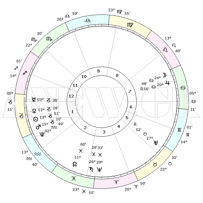 | | ΘΕΣΕΙΣ ΠΛΑΝΗΤΩΝ ΑΣΤΡΟΛΟΓΙΚΟΥ ΧΑΡΤΗ ΤΗΣ ΣΤΙΓΜΗΣ ΑΥΤΗΣ | | | | Πλανήτης | Ζώδιο | Μοίρες | Δεκαήμ. | Σε οίκο | Απόκλιση | | Ακμές των οίκων | | Ηλιος | Αιγόκερως | 13°01' | Δεύτερο | 10 | 22 S 48 | | 1ος | 02°02' | Κριός | | Σελήνη | Καρκίνος | 12°46' | Δεύτερο | 4 | 27 N 06 | | 2ος | 11°49' | Ταύρος | | Ερμής | Αιγόκερως | 02°21' | Πρώτο | 10 | 24 S 14 | | 3ος | 08°55' | Δίδυμοι | | Αφροδίτη | Αιγόκερως | 12°14' | Δεύτερο | 10 | 23 S 28 | | 4ος | 01°08' | Καρκίνος | | Αρης | Αιγόκερως | 14°32' | Δεύτερο | 10 | 23 S 32 | | 5ος | 23°32' | Καρκίνος | | Δίας | Καρκίνος | 21°02'R | Τρίτο | 4 | 22 N 02 | | 6ος | 21°15' | Λέων | | Κρόνος | Ιχθείς | 26°26' | Τρίτο | 12 | 03 S 29 | | 7ος | 02°02' | Ζυγός | | Ουρανός | Ταύρος | 27°53'R | Τρίτο | 2 | 19 N 29 | | 8ος | 11°49' | Σκορπιός | | Ποσειδώνας | Ιχθείς | 29°32' | Τρίτο | 12 | 01 S 24 | | 9ος | 08°55' | Τοξότης | | Πλούτωνας | Υδροχόος | 02°48' | Πρώτο | 11 | 23 S 12 | | 10ος | 01°08' | Αιγόκερως | | Β. Δεσμός | Ιχθείς | 12°03' | Δεύτερο | 12 | 07 S 03 | | 11ος | 23°32' | Αιγόκερως | | Ωροσκόπος | Κριός | 02°02' | Πρώτο | | | 12ος | 21°15' | Υδροχόος | | Μεσουράνημα | Αιγόκερως | 01°08' | Πρώτο | | | |