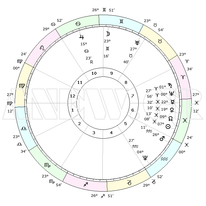 | | ΘΕΣΕΙΣ ΠΛΑΝΗΤΩΝ ΑΣΤΡΟΛΟΓΙΚΟΥ ΧΑΡΤΗ ΤΗΣ ΣΤΙΓΜΗΣ ΑΥΤΗΣ | | | | Πλανήτης | Ζώδιο | Μοίρες | Δεκαήμ. | Σε οίκο | Απόκλιση | | Ακμές των οίκων | | Ηλιος | Ιχθείς | 07°04' | Πρώτο | 6 | 08 S 55 | | 1ος | 08°24' | Παρθένος | | Σελήνη | Δίδυμοι | 22°22' | Τρίτο | 10 | 28 N 21 | | 2ος | 03°07' | Ζυγός | | Ερμής | Ιχθείς | 22°32' | Τρίτο | 7 | 00 S 31 | | 3ος | 02°28' | Σκορπιός | | Αφροδίτη | Ιχθείς | 19°05' | Δεύτερο | 7 | 05 S 37 | | 4ος | 05°25' | Τοξότης | | Αρης | Υδροχόος | 26°08' | Τρίτο | 6 | 13 S 50 | | 5ος | 09°06' | Αιγόκερως | | Δίας | Καρκίνος | 15°23'R | Δεύτερο | 11 | 22 N 53 | | 6ος | 10°29' | Υδροχόος | | Κρόνος | Κριός | 01°27' | Πρώτο | 7 | 01 S 23 | | 7ος | 08°24' | Ιχθείς | | Ουρανός | Ταύρος | 27°40' | Τρίτο | 9 | 19 N 27 | | 8ος | 03°07' | Κριός | | Ποσειδώνας | Κριός | 00°56' | Πρώτο | 7 | 00 S 50 | | 9ος | 02°28' | Ταύρος | | Πλούτωνας | Υδροχόος | 04°27' | Πρώτο | 5 | 22 S 53 | | 10ος | 05°25' | Δίδυμοι | | Β. Δεσμός | Ιχθείς | 09°13' | Πρώτο | 7 | 08 S 07 | | 11ος | 09°06' | Καρκίνος | | Ωροσκόπος | Παρθένος | 08°24' | Πρώτο | | | 12ος | 10°29' | Λέων | | Μεσουράνημα | Δίδυμοι | 05°25' | Πρώτο | | | |