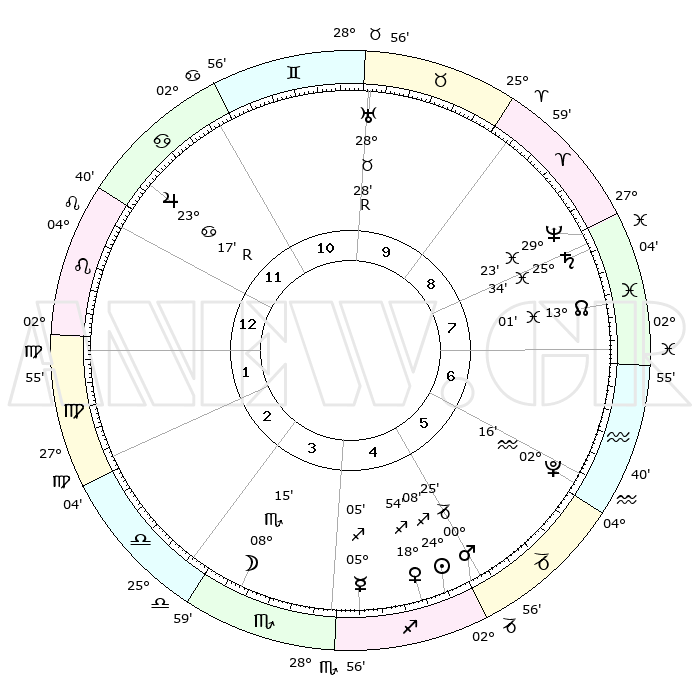 | | ΘΕΣΕΙΣ ΠΛΑΝΗΤΩΝ ΑΣΤΡΟΛΟΓΙΚΟΥ ΧΑΡΤΗ ΤΗΣ ΣΤΙΓΜΗΣ ΑΥΤΗΣ | | | | Πλανήτης | Ζώδιο | Μοίρες | Δεκαήμ. | Σε οίκο | Απόκλιση | | Ακμές των οίκων | | Ηλιος | Τοξότης | 23°04' | Τρίτο | 5 | 23 S 15 | | 1ος | 19°49' | Λέων | | Σελήνη | Ζυγός | 25°52' | Τρίτο | 3 | 13 S 11 | | 2ος | 12°36' | Παρθένος | | Ερμής | Τοξότης | 03°41' | Πρώτο | 4 | 19 S 21 | | 3ος | 10°13' | Ζυγός | | Αφροδίτη | Τοξότης | 17°35' | Δεύτερο | 4 | 22 S 41 | | 4ος | 12°53' | Σκορπιός | | Αρης | Τοξότης | 29°38' | Τρίτο | 5 | 24 S 12 | | 5ος | 17°48' | Τοξότης | | Δίας | Καρκίνος | 23°23'R | Τρίτο | 12 | 21 N 36 | | 6ος | 20°43' | Αιγόκερως | | Κρόνος | Ιχθείς | 25°32' | Τρίτο | 8 | 03 S 54 | | 7ος | 19°49' | Υδροχόος | | Ουρανός | Ταύρος | 28°30'R | Τρίτο | 10 | 19 N 37 | | 8ος | 12°36' | Ιχθείς | | Ποσειδώνας | Ιχθείς | 29°23' | Τρίτο | 8 | 01 S 29 | | 9ος | 10°13' | Κριός | | Πλούτωνας | Υδροχόος | 02°14' | Πρώτο | 6 | 23 S 20 | | 10ος | 12°53' | Ταύρος | | Β. Δεσμός | Ιχθείς | 13°05' | Δεύτερο | 8 | 06 S 39 | | 11ος | 17°48' | Δίδυμοι | | Ωροσκόπος | Λέων | 19°49' | Δεύτερο | | | 12ος | 20°43' | Καρκίνος | | Μεσουράνημα | Ταύρος | 12°53' | Δεύτερο | | | |