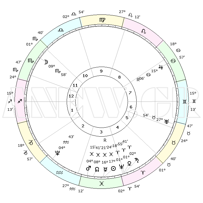 | | ΘΕΣΕΙΣ ΠΛΑΝΗΤΩΝ ΑΣΤΡΟΛΟΓΙΚΟΥ ΧΑΡΤΗ ΤΗΣ ΣΤΙΓΜΗΣ ΑΥΤΗΣ | | | | Πλανήτης | Ζώδιο | Μοίρες | Δεκαήμ. | Σε οίκο | Απόκλιση | | Ακμές των οίκων | | Ηλιος | Ιχθείς | 17°20' | Δεύτερο | 4 | 05 S 00 | | 1ος | 24°27' | Σκορπιός | | Σελήνη | Σκορπιός | 09°06' | Πρώτο | 12 | 18 S 51 | | 2ος | 24°52' | Τοξότης | | Ερμής | Ιχθείς | 16°25'R | Δεύτερο | 4 | 02 S 02 | | 3ος | 29°41' | Αιγόκερως | | Αφροδίτη | Κριός | 01°50' | Πρώτο | 4 | 00 S 24 | | 4ος | 05°32' | Ιχθείς | | Αρης | Ιχθείς | 04°12' | Πρώτο | 3 | 10 S 59 | | 5ος | 07°12' | Κριός | | Δίας | Καρκίνος | 15°06'R | Δεύτερο | 8 | 22 N 56 | | 6ος | 02°60' | Ταύρος | | Κρόνος | Κριός | 02°40' | Πρώτο | 4 | 00 S 53 | | 7ος | 24°27' | Ταύρος | | Ουρανός | Ταύρος | 27°54' | Τρίτο | 7 | 19 N 31 | | 8ος | 24°52' | Δίδυμοι | | Ποσειδώνας | Κριός | 01°18' | Πρώτο | 4 | 00 S 41 | | 9ος | 29°41' | Καρκίνος | | Πλούτωνας | Υδροχόος | 04°43' | Πρώτο | 3 | 22 S 51 | | 10ος | 05°32' | Παρθένος | | Β. Δεσμός | Ιχθείς | 08°41' | Πρώτο | 4 | 08 S 19 | | 11ος | 07°12' | Ζυγός | | Ωροσκόπος | Σκορπιός | 24°27' | Τρίτο | | | 12ος | 02°60' | Σκορπιός | | Μεσουράνημα | Παρθένος | 05°32' | Πρώτο | | | |