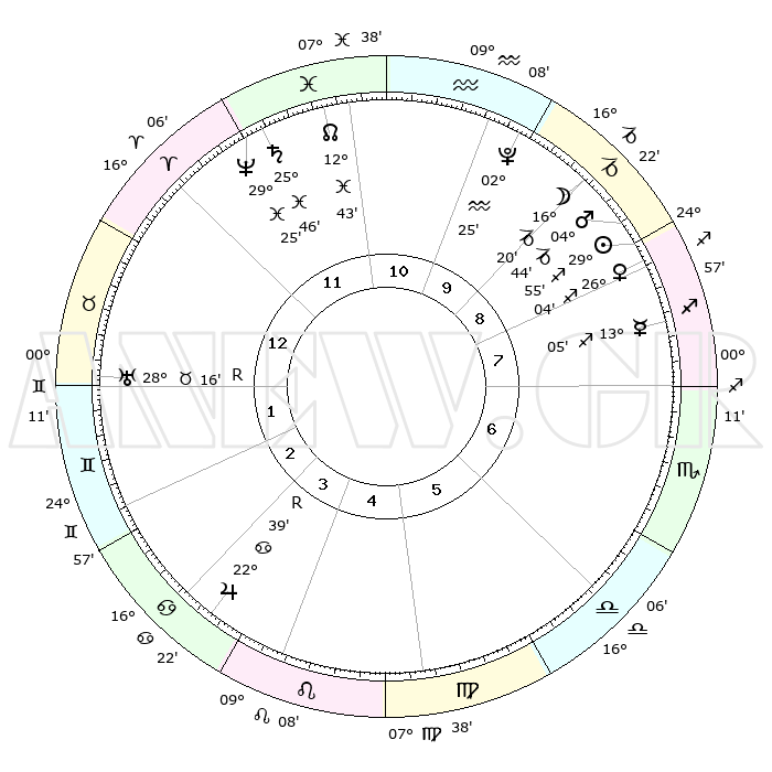 | | ΘΕΣΕΙΣ ΠΛΑΝΗΤΩΝ ΑΣΤΡΟΛΟΓΙΚΟΥ ΧΑΡΤΗ ΤΗΣ ΣΤΙΓΜΗΣ ΑΥΤΗΣ | | | | Πλανήτης | Ζώδιο | Μοίρες | Δεκαήμ. | Σε οίκο | Απόκλιση | | Ακμές των οίκων | | Ηλιος | Τοξότης | 29°51' | Τρίτο | 9 | 23 S 26 | | 1ος | 25°12' | Κριός | | Σελήνη | Αιγόκερως | 15°27' | Δεύτερο | 10 | 26 S 41 | | 2ος | 28°45' | Ταύρος | | Ερμής | Τοξότης | 12°59' | Δεύτερο | 8 | 21 S 39 | | 3ος | 22°49' | Δίδυμοι | | Αφροδίτη | Τοξότης | 25°58' | Τρίτο | 9 | 23 S 28 | | 4ος | 14°30' | Καρκίνος | | Αρης | Αιγόκερως | 04°40' | Πρώτο | 9 | 24 S 10 | | 5ος | 08°27' | Λέων | | Δίας | Καρκίνος | 22°40'R | Τρίτο | 4 | 21 N 44 | | 6ος | 10°14' | Παρθένος | | Κρόνος | Ιχθείς | 25°46' | Τρίτο | 12 | 03 S 47 | | 7ος | 25°12' | Ζυγός | | Ουρανός | Ταύρος | 28°16'R | Τρίτο | 1 | 19 N 34 | | 8ος | 28°45' | Σκορπιός | | Ποσειδώνας | Ιχθείς | 29°24' | Τρίτο | 12 | 01 S 28 | | 9ος | 22°49' | Τοξότης | | Πλούτωνας | Υδροχόος | 02°25' | Πρώτο | 10 | 23 S 17 | | 10ος | 14°30' | Αιγόκερως | | Β. Δεσμός | Ιχθείς | 12°44' | Δεύτερο | 12 | 06 S 47 | | 11ος | 08°27' | Υδροχόος | | Ωροσκόπος | Κριός | 25°12' | Τρίτο | | | 12ος | 10°14' | Ιχθείς | | Μεσουράνημα | Αιγόκερως | 14°30' | Δεύτερο | | | |