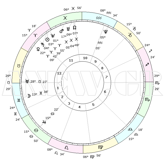 | | ΘΕΣΕΙΣ ΠΛΑΝΗΤΩΝ ΑΣΤΡΟΛΟΓΙΚΟΥ ΧΑΡΤΗ ΤΗΣ ΣΤΙΓΜΗΣ ΑΥΤΗΣ | | | | Πλανήτης | Ζώδιο | Μοίρες | Δεκαήμ. | Σε οίκο | Απόκλιση | | Ακμές των οίκων | | Ηλιος | Κριός | 03°35' | Πρώτο | 12 | 01 N 26 | | 1ος | 26°13' | Κριός | | Σελήνη | Δίδυμοι | 12°40' | Δεύτερο | 2 | 27 N 29 | | 2ος | 29°29' | Ταύρος | | Ερμής | Ιχθείς | 09°03' | Πρώτο | 11 | 08 S 00 | | 3ος | 23°27' | Δίδυμοι | | Αφροδίτη | Κριός | 22°04' | Τρίτο | 12 | 07 N 54 | | 4ος | 15°08' | Καρκίνος | | Αρης | Ιχθείς | 17°02' | Δεύτερο | 12 | 06 S 06 | | 5ος | 09°10' | Λέων | | Δίας | Καρκίνος | 15°22' | Δεύτερο | 4 | 22 N 55 | | 6ος | 11°09' | Παρθένος | | Κρόνος | Κριός | 04°42' | Πρώτο | 12 | 00 S 05 | | 7ος | 26°13' | Ζυγός | | Ουρανός | Ταύρος | 28°27' | Τρίτο | 1 | 19 N 38 | | 8ος | 29°29' | Σκορπιός | | Ποσειδώνας | Κριός | 01°55' | Πρώτο | 12 | 00 S 26 | | 9ος | 23°27' | Τοξότης | | Πλούτωνας | Υδροχόος | 05°05' | Πρώτο | 10 | 22 S 48 | | 10ος | 15°08' | Αιγόκερως | | Β. Δεσμός | Ιχθείς | 07°49' | Πρώτο | 11 | 08 S 38 | | 11ος | 09°10' | Υδροχόος | | Ωροσκόπος | Κριός | 26°13' | Τρίτο | | | 12ος | 11°09' | Ιχθείς | | Μεσουράνημα | Αιγόκερως | 15°08' | Δεύτερο | | | |