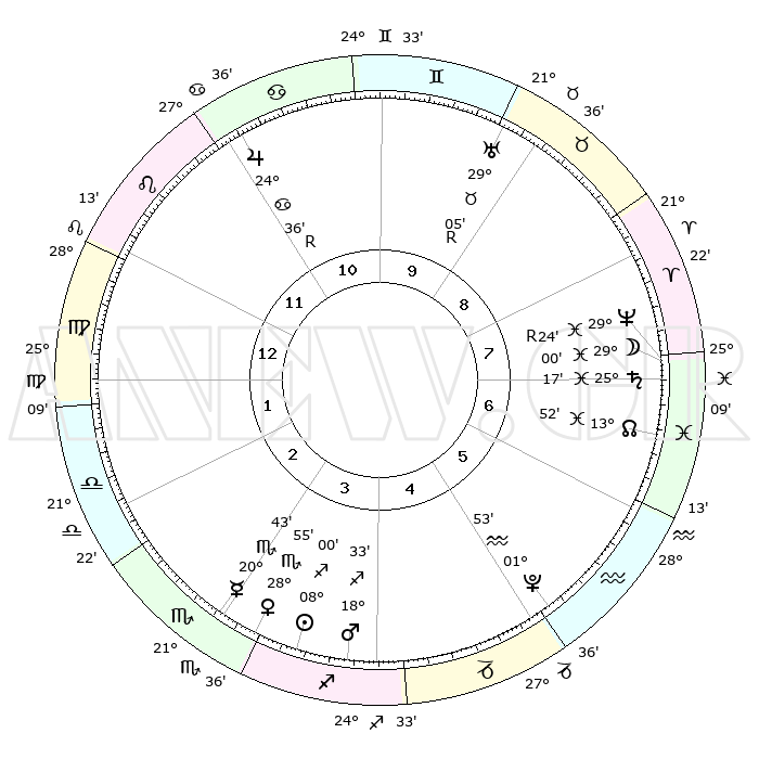 | | ΘΕΣΕΙΣ ΠΛΑΝΗΤΩΝ ΑΣΤΡΟΛΟΓΙΚΟΥ ΧΑΡΤΗ ΤΗΣ ΣΤΙΓΜΗΣ ΑΥΤΗΣ | | | | Πλανήτης | Ζώδιο | Μοίρες | Δεκαήμ. | Σε οίκο | Απόκλιση | | Ακμές των οίκων | | Ηλιος | Τοξότης | 07°59' | Πρώτο | 3 | 21 S 38 | | 1ος | 17°34' | Παρθένος | | Σελήνη | Ιχθείς | 28°39' | Τρίτο | 7 | 00 N 36 | | 2ος | 13°10' | Ζυγός | | Ερμής | Σκορπιός | 20°43' | Τρίτο | 3 | 15 S 27 | | 3ος | 13°03' | Σκορπιός | | Αφροδίτη | Σκορπιός | 28°53' | Τρίτο | 3 | 19 S 11 | | 4ος | 15°59' | Τοξότης | | Αρης | Τοξότης | 18°32' | Δεύτερο | 4 | 23 S 35 | | 5ος | 19°15' | Αιγόκερως | | Δίας | Καρκίνος | 24°36'R | Τρίτο | 11 | 21 N 21 | | 6ος | 20°10' | Υδροχόος | | Κρόνος | Ιχθείς | 25°17' | Τρίτο | 7 | 04 S 03 | | 7ος | 17°34' | Ιχθείς | | Ουρανός | Ταύρος | 29°05'R | Τρίτο | 9 | 19 N 45 | | 8ος | 13°10' | Κριός | | Ποσειδώνας | Ιχθείς | 29°24'R | Τρίτο | 7 | 01 S 29 | | 9ος | 13°03' | Ταύρος | | Πλούτωνας | Υδροχόος | 01°53' | Πρώτο | 5 | 23 S 24 | | 10ος | 15°59' | Δίδυμοι | | Β. Δεσμός | Ιχθείς | 13°52' | Δεύτερο | 6 | 06 S 21 | | 11ος | 19°15' | Καρκίνος | | Ωροσκόπος | Παρθένος | 17°34' | Δεύτερο | | | 12ος | 20°10' | Λέων | | Μεσουράνημα | Δίδυμοι | 15°59' | Δεύτερο | | | |