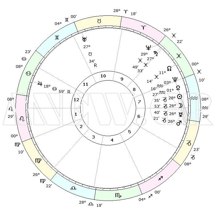 | | ΘΕΣΕΙΣ ΠΛΑΝΗΤΩΝ ΑΣΤΡΟΛΟΓΙΚΟΥ ΧΑΡΤΗ ΤΗΣ ΣΤΙΓΜΗΣ ΑΥΤΗΣ | | | | Πλανήτης | Ζώδιο | Μοίρες | Δεκαήμ. | Σε οίκο | Απόκλιση | | Ακμές των οίκων | | Ηλιος | Αιγόκερως | 28°31' | Τρίτο | 7 | 20 S 27 | | 1ος | 17°50' | Καρκίνος | | Σελήνη | Αιγόκερως | 26°00' | Τρίτο | 7 | 24 S 26 | | 2ος | 08°19' | Λέων | | Ερμής | Αιγόκερως | 26°33' | Τρίτο | 7 | 22 S 46 | | 3ος | 01°48' | Παρθένος | | Αφροδίτη | Υδροχόος | 01°22' | Πρώτο | 7 | 20 S 54 | | 4ος | 01°04' | Ζυγός | | Αρης | Αιγόκερως | 26°17' | Τρίτο | 7 | 21 S 51 | | 5ος | 06°58' | Σκορπιός | | Δίας | Καρκίνος | 18°60'R | Δεύτερο | 1 | 22 N 22 | | 6ος | 14°43' | Τοξότης | | Κρόνος | Ιχθείς | 27°32' | Τρίτο | 9 | 03 S 00 | | 7ος | 17°50' | Αιγόκερως | | Ουρανός | Ταύρος | 27°34'R | Τρίτο | 11 | 19 N 26 | | 8ος | 08°19' | Υδροχόος | | Ποσειδώνας | Ιχθείς | 29°49' | Τρίτο | 9 | 01 S 17 | | 9ος | 01°48' | Ιχθείς | | Πλούτωνας | Υδροχόος | 03°16' | Πρώτο | 7 | 23 S 06 | | 10ος | 01°04' | Κριός | | Β. Δεσμός | Ιχθείς | 11°14' | Δεύτερο | 9 | 07 S 21 | | 11ος | 06°58' | Ταύρος | | Ωροσκόπος | Καρκίνος | 17°50' | Δεύτερο | | | 12ος | 14°43' | Δίδυμοι | | Μεσουράνημα | Κριός | 01°04' | Πρώτο | | | |
