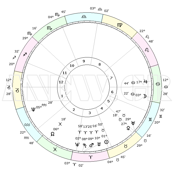 | | ΘΕΣΕΙΣ ΠΛΑΝΗΤΩΝ ΑΣΤΡΟΛΟΓΙΚΟΥ ΧΑΡΤΗ ΤΗΣ ΣΤΙΓΜΗΣ ΑΥΤΗΣ | | | | Πλανήτης | Ζώδιο | Μοίρες | Δεκαήμ. | Σε οίκο | Απόκλιση | | Ακμές των οίκων | | Ηλιος | Ταύρος | 01°46' | Πρώτο | 4 | 12 N 05 | | 1ος | 17°59' | Τοξότης | | Σελήνη | Καρκίνος | 02°18' | Πρώτο | 7 | 28 N 02 | | 2ος | 22°18' | Αιγόκερως | | Ερμής | Κριός | 10°09' | Δεύτερο | 4 | 01 N 39 | | 3ος | 00°57' | Ιχθείς | | Αφροδίτη | Ταύρος | 27°13' | Τρίτο | 5 | 20 N 00 | | 4ος | 06°25' | Κριός | | Αρης | Κριός | 09°21' | Πρώτο | 4 | 02 N 50 | | 5ος | 04°44' | Ταύρος | | Δίας | Καρκίνος | 17°44' | Δεύτερο | 7 | 22 N 38 | | 6ος | 27°34' | Ταύρος | | Κρόνος | Κριός | 08°12' | Πρώτο | 4 | 01 N 16 | | 7ος | 17°59' | Δίδυμοι | | Ουρανός | Ταύρος | 29°47' | Τρίτο | 6 | 19 N 56 | | 8ος | 22°18' | Καρκίνος | | Ποσειδώνας | Κριός | 02°58' | Πρώτο | 3 | 00 S 02 | | 9ος | 00°57' | Παρθένος | | Πλούτωνας | Υδροχόος | 05°27' | Πρώτο | 2 | 22 S 48 | | 10ος | 06°25' | Ζυγός | | Β. Δεσμός | Ιχθείς | 06°18' | Πρώτο | 3 | 09 S 12 | | 11ος | 04°44' | Σκορπιός | | Ωροσκόπος | Τοξότης | 17°59' | Δεύτερο | | | 12ος | 27°34' | Σκορπιός | | Μεσουράνημα | Ζυγός | 06°25' | Πρώτο | | | |