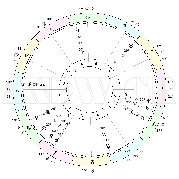 | | ΘΕΣΕΙΣ ΠΛΑΝΗΤΩΝ ΑΣΤΡΟΛΟΓΙΚΟΥ ΧΑΡΤΗ ΤΗΣ ΣΤΙΓΜΗΣ ΑΥΤΗΣ | | | | Πλανήτης | Ζώδιο | Μοίρες | Δεκαήμ. | Σε οίκο | Απόκλιση | | Ακμές των οίκων | | Ηλιος | Σκορπιός | 23°54' | Τρίτο | 3 | 18 S 44 | | 1ος | 25°08' | Παρθένος | | Σελήνη | Ζυγός | 07°22' | Πρώτο | 1 | 04 S 36 | | 2ος | 21°21' | Ζυγός | | Ερμής | Τοξότης | 03°44'R | Πρώτο | 3 | 21 S 48 | | 3ος | 21°36' | Σκορπιός | | Αφροδίτη | Σκορπιός | 11°23' | Δεύτερο | 2 | 14 S 07 | | 4ος | 24°32' | Τοξότης | | Αρης | Τοξότης | 08°17' | Πρώτο | 3 | 22 S 13 | | 5ος | 27°35' | Αιγόκερως | | Δίας | Καρκίνος | 25°07'R | Τρίτο | 10 | 21 N 13 | | 6ος | 28°13' | Υδροχόος | | Κρόνος | Ιχθείς | 25°25'R | Τρίτο | 7 | 04 S 03 | | 7ος | 25°08' | Ιχθείς | | Ουρανός | Ταύρος | 29°40'R | Τρίτο | 9 | 19 N 52 | | 8ος | 21°21' | Κριός | | Ποσειδώνας | Ιχθείς | 29°32'R | Τρίτο | 7 | 01 S 26 | | 9ος | 21°36' | Ταύρος | | Πλούτωνας | Υδροχόος | 01°38' | Πρώτο | 5 | 23 S 28 | | 10ος | 24°32' | Δίδυμοι | | Β. Δεσμός | Ιχθείς | 14°36' | Δεύτερο | 6 | 06 S 04 | | 11ος | 27°35' | Καρκίνος | | Ωροσκόπος | Παρθένος | 25°08' | Τρίτο | | | 12ος | 28°13' | Λέων | | Μεσουράνημα | Δίδυμοι | 24°32' | Τρίτο | | | |