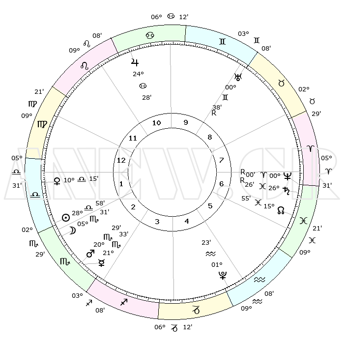 | ΘΕΣΕΙΣ ΠΛΑΝΗΤΩΝ ΑΣΤΡΟΛΟΓΙΚΟΥ ΧΑΡΤΗ ΤΗΣ ΣΤΙΓΜΗΣ ΑΥΤΗΣ | | Πλανήτης | Ζώδιο | Μοίρες | Δεκαήμ. | Σε οίκο | Απόκλιση | | Ακμές των οίκων | Ηλιος | Ζυγός | 28°36' | Τρίτο | 5 | 10 S 58 | | 1ος | 15°06' | Δίδυμοι | Σελήνη | Σκορπιός | 01°11' | Πρώτο | 5 | 15 S 12 | | 2ος | 07°21' | Καρκίνος | Ερμής | Σκορπιός | 21°05' | Τρίτο | 6 | 20 S 19 | | 3ος | 28°35' | Καρκίνος | Αφροδίτη | Ζυγός | 09°47' | Πρώτο | 5 | 02 S 28 | | 4ος | 22°48' | Λέων | Αρης | Σκορπιός | 20°14' | Τρίτο | 6 | 18 S 05 | | 5ος | 24°03' | Παρθένος | Δίας | Καρκίνος | 24°27' | Τρίτο | 2 | 21 N 17 | | 6ος | 04°10' | Σκορπιός | Κρόνος | Ιχθείς | 26°28'R | Τρίτο | 11 | 03 S 41 | | 7ος | 15°06' | Τοξότης | Ουρανός | Δίδυμοι | 00°38'R | Πρώτο | 12 | 20 N 04 | | 8ος | 07°21' | Αιγόκερως | Ποσειδώνας | Κριός | 00°01'R | Πρώτο | 11 | 01 S 15 | | 9ος | 28°35' | Αιγόκερως | Πλούτωνας | Υδροχόος | 01°23' | Πρώτο | 9 | 23 S 32 | | 10ος | 22°48' | Υδροχόος | Β. Δεσμός | Ιχθείς | 15°57' | Δεύτερο | 10 | 05 S 33 | | 11ος | 24°03' | Ιχθείς | Ωροσκόπος | Δίδυμοι | 15°06' | Δεύτερο | | | 12ος | 04°10' | Ταύρος | Μεσουράνημα | Υδροχόος | 22°48' | Τρίτο | | | |