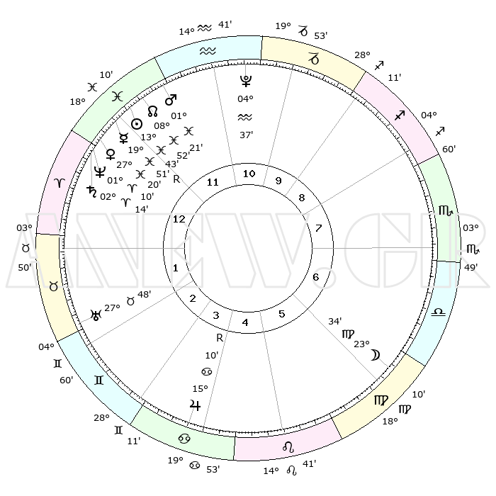 | | ΘΕΣΕΙΣ ΠΛΑΝΗΤΩΝ ΑΣΤΡΟΛΟΓΙΚΟΥ ΧΑΡΤΗ ΤΗΣ ΣΤΙΓΜΗΣ ΑΥΤΗΣ | | | | Πλανήτης | Ζώδιο | Μοίρες | Δεκαήμ. | Σε οίκο | Απόκλιση | | Ακμές των οίκων | | Ηλιος | Ιχθείς | 13°40' | Δεύτερο | 12 | 06 S 25 | | 1ος | 02°48' | Κριός | | Σελήνη | Παρθένος | 22°51' | Τρίτο | 6 | 01 N 40 | | 2ος | 12°25' | Ταύρος | | Ερμής | Ιχθείς | 19°53'R | Δεύτερο | 12 | 00 S 39 | | 3ος | 09°23' | Δίδυμοι | | Αφροδίτη | Ιχθείς | 27°16' | Τρίτο | 12 | 02 S 17 | | 4ος | 01°35' | Καρκίνος | | Αρης | Ιχθείς | 01°18' | Πρώτο | 12 | 12 S 02 | | 5ος | 24°01' | Καρκίνος | | Δίας | Καρκίνος | 15°10'R | Δεύτερο | 4 | 22 N 55 | | 6ος | 21°51' | Λέων | | Κρόνος | Κριός | 02°14' | Πρώτο | 12 | 01 S 04 | | 7ος | 02°48' | Ζυγός | | Ουρανός | Ταύρος | 27°48' | Τρίτο | 2 | 19 N 29 | | 8ος | 12°25' | Σκορπιός | | Ποσειδώνας | Κριός | 01°10' | Πρώτο | 12 | 00 S 44 | | 9ος | 09°23' | Τοξότης | | Πλούτωνας | Υδροχόος | 04°37' | Πρώτο | 11 | 22 S 52 | | 10ος | 01°35' | Αιγόκερως | | Β. Δεσμός | Ιχθείς | 08°52' | Πρώτο | 12 | 08 S 14 | | 11ος | 24°01' | Αιγόκερως | | Ωροσκόπος | Κριός | 02°48' | Πρώτο | | | 12ος | 21°51' | Υδροχόος | | Μεσουράνημα | Αιγόκερως | 01°35' | Πρώτο | | | |