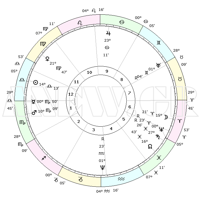 | ΘΕΣΕΙΣ ΠΛΑΝΗΤΩΝ ΑΣΤΡΟΛΟΓΙΚΟΥ ΧΑΡΤΗ ΤΗΣ ΣΤΙΓΜΗΣ ΑΥΤΗΣ | | Πλανήτης | Ζώδιο | Μοίρες | Δεκαήμ. | Σε οίκο | Απόκλιση | | Ακμές των οίκων | Ηλιος | Ζυγός | 14°08' | Δεύτερο | 1 | 05 S 34 | | 1ος | 03°04' | Ζυγός | Σελήνη | Κριός | 13°60' | Δεύτερο | 7 | 07 N 37 | | 2ος | 29°52' | Ζυγός | Ερμής | Σκορπιός | 00°42' | Πρώτο | 2 | 12 S 30 | | 3ος | 00°25' | Τοξότης | Αφροδίτη | Παρθένος | 21°40' | Τρίτο | 12 | 04 N 36 | | 4ος | 03°27' | Αιγόκερως | Αρης | Σκορπιός | 10°05' | Δεύτερο | 2 | 14 S 58 | | 5ος | 06°24' | Υδροχόος | Δίας | Καρκίνος | 23°10' | Τρίτο | 10 | 21 N 29 | | 6ος | 06°42' | Ιχθείς | Κρόνος | Ιχθείς | 27°26'R | Τρίτο | 6 | 03 S 19 | | 7ος | 03°04' | Κριός | Ουρανός | Δίδυμοι | 01°04'R | Πρώτο | 9 | 20 N 10 | | 8ος | 29°52' | Κριός | Ποσειδώνας | Κριός | 00°23'R | Πρώτο | 6 | 01 S 07 | | 9ος | 00°25' | Δίδυμοι | Πλούτωνας | Υδροχόος | 01°23'R | Πρώτο | 4 | 23 S 32 | | 10ος | 03°27' | Καρκίνος | Β. Δεσμός | Ιχθείς | 16°43' | Δεύτερο | 6 | 05 S 15 | | 11ος | 06°24' | Λέων | Ωροσκόπος | Ζυγός | 03°04' | Πρώτο | | | 12ος | 06°42' | Παρθένος | Μεσουράνημα | Καρκίνος | 03°27' | Πρώτο | | | |