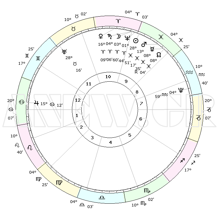 | | ΘΕΣΕΙΣ ΠΛΑΝΗΤΩΝ ΑΣΤΡΟΛΟΓΙΚΟΥ ΧΑΡΤΗ ΤΗΣ ΣΤΙΓΜΗΣ ΑΥΤΗΣ | | | | Πλανήτης | Ζώδιο | Μοίρες | Δεκαήμ. | Σε οίκο | Απόκλιση | | Ακμές των οίκων | | Ηλιος | Ιχθείς | 28°47' | Τρίτο | 10 | 00 S 29 | | 1ος | 00°49' | Καρκίνος | | Σελήνη | Κριός | 03°08' | Πρώτο | 10 | 03 N 13 | | 2ος | 21°33' | Καρκίνος | | Ερμής | Ιχθείς | 08°36'R | Πρώτο | 9 | 07 S 06 | | 3ος | 13°25' | Λέων | | Αφροδίτη | Κριός | 16°05' | Δεύτερο | 11 | 05 N 29 | | 4ος | 09°52' | Παρθένος | | Αρης | Ιχθείς | 13°14' | Δεύτερο | 10 | 07 S 35 | | 5ος | 13°56' | Ζυγός | | Δίας | Καρκίνος | 15°12' | Δεύτερο | 1 | 22 N 56 | | 6ος | 23°52' | Σκορπιός | | Κρόνος | Κριός | 04°05' | Πρώτο | 10 | 00 S 20 | | 7ος | 00°49' | Αιγόκερως | | Ουρανός | Ταύρος | 28°16' | Τρίτο | 12 | 19 N 36 | | 8ος | 21°33' | Αιγόκερως | | Ποσειδώνας | Κριός | 01°44' | Πρώτο | 10 | 00 S 31 | | 9ος | 13°25' | Υδροχόος | | Πλούτωνας | Υδροχόος | 04°59' | Πρώτο | 8 | 22 S 49 | | 10ος | 09°52' | Ιχθείς | | Β. Δεσμός | Ιχθείς | 08°04' | Πρώτο | 9 | 08 S 32 | | 11ος | 13°56' | Κριός | | Ωροσκόπος | Καρκίνος | 00°49' | Πρώτο | | | 12ος | 23°52' | Ταύρος | | Μεσουράνημα | Ιχθείς | 09°52' | Πρώτο | | | |