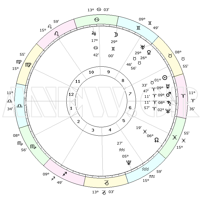 | | ΘΕΣΕΙΣ ΠΛΑΝΗΤΩΝ ΑΣΤΡΟΛΟΓΙΚΟΥ ΧΑΡΤΗ ΤΗΣ ΣΤΙΓΜΗΣ ΑΥΤΗΣ | | | | Πλανήτης | Ζώδιο | Μοίρες | Δεκαήμ. | Σε οίκο | Απόκλιση | | Ακμές των οίκων | | Ηλιος | Ταύρος | 01°27' | Πρώτο | 8 | 11 N 59 | | 1ος | 15°60' | Παρθένος | | Σελήνη | Δίδυμοι | 27°44' | Τρίτο | 10 | 28 N 12 | | 2ος | 11°26' | Ζυγός | | Ερμής | Κριός | 09°39' | Πρώτο | 7 | 01 N 26 | | 3ος | 11°15' | Σκορπιός | | Αφροδίτη | Ταύρος | 26°50' | Τρίτο | 9 | 19 N 54 | | 4ος | 14°11' | Τοξότης | | Αρης | Κριός | 09°07' | Πρώτο | 7 | 02 N 45 | | 5ος | 17°30' | Αιγόκερως | | Δίας | Καρκίνος | 17°42' | Δεύτερο | 11 | 22 N 39 | | 6ος | 18°30' | Υδροχόος | | Κρόνος | Κριός | 08°10' | Πρώτο | 7 | 01 N 16 | | 7ος | 15°60' | Ιχθείς | | Ουρανός | Ταύρος | 29°46' | Τρίτο | 9 | 19 N 56 | | 8ος | 11°26' | Κριός | | Ποσειδώνας | Κριός | 02°57' | Πρώτο | 7 | 00 S 02 | | 9ος | 11°15' | Ταύρος | | Πλούτωνας | Υδροχόος | 05°27' | Πρώτο | 5 | 22 S 48 | | 10ος | 14°11' | Δίδυμοι | | Β. Δεσμός | Ιχθείς | 06°19' | Πρώτο | 6 | 09 S 12 | | 11ος | 17°30' | Καρκίνος | | Ωροσκόπος | Παρθένος | 15°60' | Δεύτερο | | | 12ος | 18°30' | Λέων | | Μεσουράνημα | Δίδυμοι | 14°11' | Δεύτερο | | | |