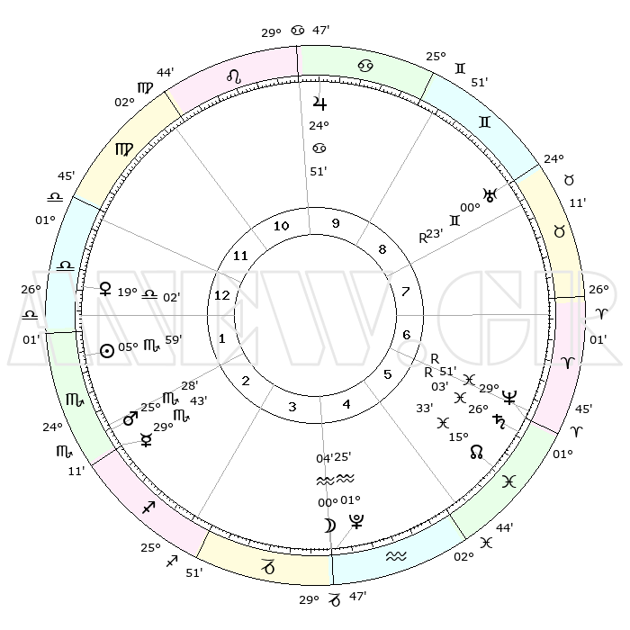 | | ΘΕΣΕΙΣ ΠΛΑΝΗΤΩΝ ΑΣΤΡΟΛΟΓΙΚΟΥ ΧΑΡΤΗ ΤΗΣ ΣΤΙΓΜΗΣ ΑΥΤΗΣ | | | | Πλανήτης | Ζώδιο | Μοίρες | Δεκαήμ. | Σε οίκο | Απόκλιση | | Ακμές των οίκων | | Ηλιος | Σκορπιός | 05°38' | Πρώτο | 5 | 13 S 24 | | 1ος | 10°57' | Καρκίνος | | Σελήνη | Αιγόκερως | 25°37' | Τρίτο | 7 | 24 S 58 | | 2ος | 01°22' | Λέων | | Ερμής | Σκορπιός | 29°20' | Τρίτο | 5 | 22 S 46 | | 3ος | 24°05' | Λέων | | Αφροδίτη | Ζυγός | 18°36' | Δεύτερο | 4 | 05 S 53 | | 4ος | 22°13' | Παρθένος | | Αρης | Σκορπιός | 25°13' | Τρίτο | 5 | 19 S 25 | | 5ος | 27°36' | Ζυγός | | Δίας | Καρκίνος | 24°50' | Τρίτο | 1 | 21 N 14 | | 6ος | 06°24' | Τοξότης | | Κρόνος | Ιχθείς | 26°05'R | Τρίτο | 10 | 03 S 50 | | 7ος | 10°57' | Αιγόκερως | | Ουρανός | Δίδυμοι | 00°24'R | Πρώτο | 11 | 20 N 01 | | 8ος | 01°22' | Υδροχόος | | Ποσειδώνας | Ιχθείς | 29°51'R | Τρίτο | 10 | 01 S 19 | | 9ος | 24°05' | Υδροχόος | | Πλούτωνας | Υδροχόος | 01°25' | Πρώτο | 8 | 23 S 31 | | 10ος | 22°13' | Ιχθείς | | Β. Δεσμός | Ιχθείς | 15°34' | Δεύτερο | 9 | 05 S 41 | | 11ος | 27°36' | Κριός | | Ωροσκόπος | Καρκίνος | 10°57' | Δεύτερο | | | 12ος | 06°24' | Δίδυμοι | | Μεσουράνημα | Ιχθείς | 22°13' | Τρίτο | | | |