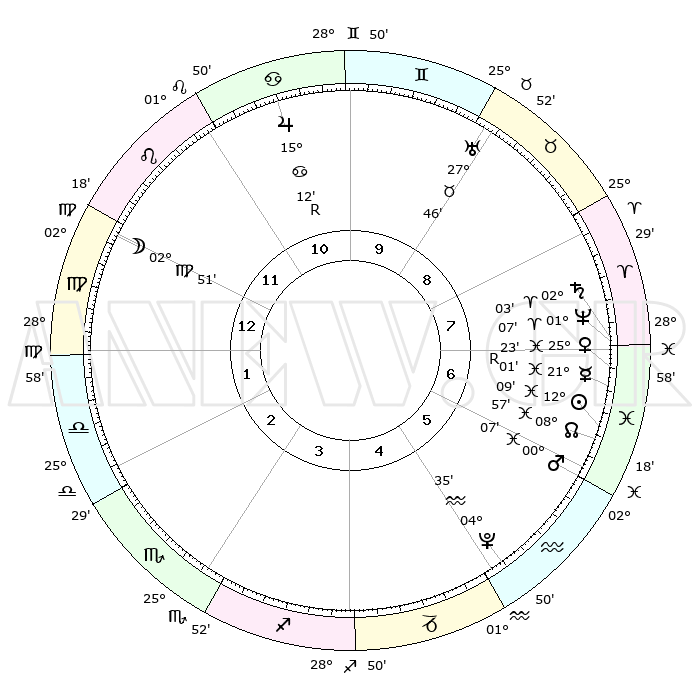 | | ΘΕΣΕΙΣ ΠΛΑΝΗΤΩΝ ΑΣΤΡΟΛΟΓΙΚΟΥ ΧΑΡΤΗ ΤΗΣ ΣΤΙΓΜΗΣ ΑΥΤΗΣ | | | | Πλανήτης | Ζώδιο | Μοίρες | Δεκαήμ. | Σε οίκο | Απόκλιση | | Ακμές των οίκων | | Ηλιος | Ιχθείς | 12°05' | Δεύτερο | 7 | 07 S 01 | | 1ος | 10°59' | Παρθένος | | Σελήνη | Παρθένος | 02°02' | Πρώτο | 12 | 11 N 21 | | 2ος | 05°57' | Ζυγός | | Ερμής | Ιχθείς | 21°04'R | Τρίτο | 7 | 00 S 18 | | 3ος | 05°28' | Σκορπιός | | Αφροδίτη | Ιχθείς | 25°19' | Τρίτο | 7 | 03 S 05 | | 4ος | 08°25' | Τοξότης | | Αρης | Ιχθείς | 00°04' | Πρώτο | 6 | 12 S 28 | | 5ος | 11°57' | Αιγόκερως | | Δίας | Καρκίνος | 15°12'R | Δεύτερο | 11 | 22 N 55 | | 6ος | 13°12' | Υδροχόος | | Κρόνος | Κριός | 02°02' | Πρώτο | 7 | 01 S 09 | | 7ος | 10°59' | Ιχθείς | | Ουρανός | Ταύρος | 27°46' | Τρίτο | 9 | 19 N 29 | | 8ος | 05°57' | Κριός | | Ποσειδώνας | Κριός | 01°07' | Πρώτο | 7 | 00 S 45 | | 9ος | 05°28' | Ταύρος | | Πλούτωνας | Υδροχόος | 04°35' | Πρώτο | 5 | 22 S 52 | | 10ος | 08°25' | Δίδυμοι | | Β. Δεσμός | Ιχθείς | 08°57' | Πρώτο | 6 | 08 S 13 | | 11ος | 11°57' | Καρκίνος | | Ωροσκόπος | Παρθένος | 10°59' | Δεύτερο | | | 12ος | 13°12' | Λέων | | Μεσουράνημα | Δίδυμοι | 08°25' | Πρώτο | | | |