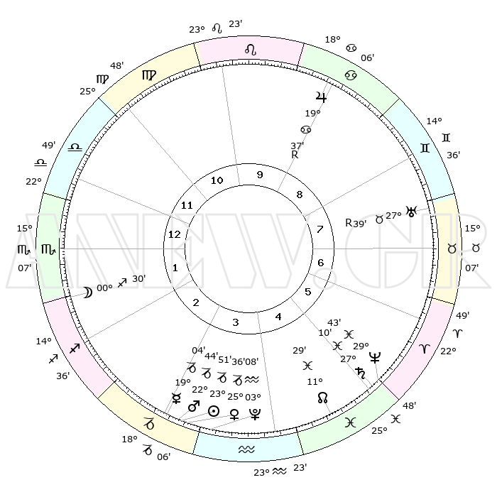 | | ΘΕΣΕΙΣ ΠΛΑΝΗΤΩΝ ΑΣΤΡΟΛΟΓΙΚΟΥ ΧΑΡΤΗ ΤΗΣ ΣΤΙΓΜΗΣ ΑΥΤΗΣ | | | | Πλανήτης | Ζώδιο | Μοίρες | Δεκαήμ. | Σε οίκο | Απόκλιση | | Ακμές των οίκων | | Ηλιος | Αιγόκερως | 23°46' | Τρίτο | 3 | 21 S 21 | | 1ος | 23°32' | Ζυγός | | Σελήνη | Σκορπιός | 29°37' | Τρίτο | 2 | 24 S 59 | | 2ος | 21°34' | Σκορπιός | | Ερμής | Αιγόκερως | 18°57' | Δεύτερο | 3 | 23 S 48 | | 3ος | 23°04' | Τοξότης | | Αφροδίτη | Αιγόκερως | 25°30' | Τρίτο | 3 | 21 S 58 | | 4ος | 26°51' | Αιγόκερως | | Αρης | Αιγόκερως | 22°41' | Τρίτο | 3 | 22 S 29 | | 5ος | 29°48' | Υδροχόος | | Δίας | Καρκίνος | 19°37'R | Δεύτερο | 9 | 22 N 16 | | 6ος | 29°00' | Ιχθείς | | Κρόνος | Ιχθείς | 27°10' | Τρίτο | 5 | 03 S 10 | | 7ος | 23°32' | Κριός | | Ουρανός | Ταύρος | 27°39'R | Τρίτο | 8 | 19 N 26 | | 8ος | 21°34' | Ταύρος | | Ποσειδώνας | Ιχθείς | 29°43' | Τρίτο | 6 | 01 S 20 | | 9ος | 23°04' | Δίδυμοι | | Πλούτωνας | Υδροχόος | 03°08' | Πρώτο | 4 | 23 S 08 | | 10ος | 26°51' | Καρκίνος | | Β. Δεσμός | Ιχθείς | 11°29' | Δεύτερο | 5 | 07 S 15 | | 11ος | 29°48' | Λέων | | Ωροσκόπος | Ζυγός | 23°32' | Τρίτο | | | 12ος | 29°00' | Παρθένος | | Μεσουράνημα | Καρκίνος | 26°51' | Τρίτο | | | |