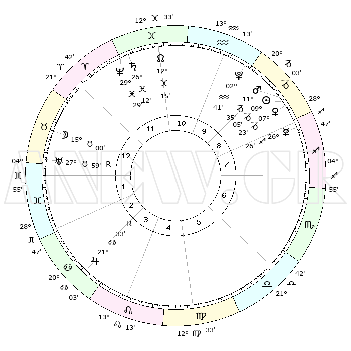 | | ΘΕΣΕΙΣ ΠΛΑΝΗΤΩΝ ΑΣΤΡΟΛΟΓΙΚΟΥ ΧΑΡΤΗ ΤΗΣ ΣΤΙΓΜΗΣ ΑΥΤΗΣ | | | | Πλανήτης | Ζώδιο | Μοίρες | Δεκαήμ. | Σε οίκο | Απόκλιση | | Ακμές των οίκων | | Ηλιος | Αιγόκερως | 09°01' | Πρώτο | 9 | 23 S 08 | | 1ος | 04°19' | Ταύρος | | Σελήνη | Ταύρος | 14°02' | Δεύτερο | 1 | 20 N 21 | | 2ος | 05°21' | Δίδυμοι | | Ερμής | Τοξότης | 26°20' | Τρίτο | 8 | 23 S 47 | | 3ος | 28°30' | Δίδυμοι | | Αφροδίτη | Αιγόκερως | 07°18' | Πρώτο | 9 | 23 S 41 | | 4ος | 20°13' | Καρκίνος | | Αρης | Αιγόκερως | 11°31' | Δεύτερο | 9 | 23 S 49 | | 5ος | 15°04' | Λέων | | Δίας | Καρκίνος | 21°33'R | Τρίτο | 4 | 21 N 56 | | 6ος | 18°38' | Παρθένος | | Κρόνος | Ιχθείς | 26°12' | Τρίτο | 12 | 03 S 35 | | 7ος | 04°19' | Σκορπιός | | Ουρανός | Ταύρος | 27°59'R | Τρίτο | 1 | 19 N 31 | | 8ος | 05°21' | Τοξότης | | Ποσειδώνας | Ιχθείς | 29°29' | Τρίτο | 12 | 01 S 26 | | 9ος | 28°30' | Τοξότης | | Πλούτωνας | Υδροχόος | 02°41' | Πρώτο | 10 | 23 S 14 | | 10ος | 20°13' | Αιγόκερως | | Β. Δεσμός | Ιχθείς | 12°15' | Δεύτερο | 11 | 06 S 58 | | 11ος | 15°04' | Υδροχόος | | Ωροσκόπος | Ταύρος | 04°19' | Πρώτο | | | 12ος | 18°38' | Ιχθείς | | Μεσουράνημα | Αιγόκερως | 20°13' | Τρίτο | | | |