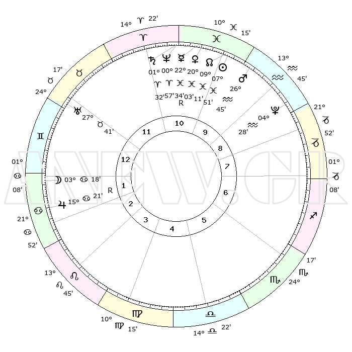 | | ΘΕΣΕΙΣ ΠΛΑΝΗΤΩΝ ΑΣΤΡΟΛΟΓΙΚΟΥ ΧΑΡΤΗ ΤΗΣ ΣΤΙΓΜΗΣ ΑΥΤΗΣ | | | | Πλανήτης | Ζώδιο | Μοίρες | Δεκαήμ. | Σε οίκο | Απόκλιση | | Ακμές των οίκων | | Ηλιος | Ιχθείς | 07°48' | Πρώτο | 10 | 08 S 39 | | 1ος | 11°14' | Δίδυμοι | | Σελήνη | Καρκίνος | 02°30' | Πρώτο | 1 | 28 N 15 | | 2ος | 04°03' | Καρκίνος | | Ερμής | Ιχθείς | 22°34' | Τρίτο | 11 | 00 S 22 | | 3ος | 25°15' | Καρκίνος | | Αφροδίτη | Ιχθείς | 19°58' | Δεύτερο | 11 | 05 S 15 | | 4ος | 19°02' | Λέων | | Αρης | Υδροχόος | 26°42' | Τρίτο | 10 | 13 S 38 | | 5ος | 19°33' | Παρθένος | | Δίας | Καρκίνος | 15°21'R | Δεύτερο | 2 | 22 N 53 | | 6ος | 29°23' | Ζυγός | | Κρόνος | Κριός | 01°32' | Πρώτο | 11 | 01 S 21 | | 7ος | 11°14' | Τοξότης | | Ουρανός | Ταύρος | 27°41' | Τρίτο | 12 | 19 N 28 | | 8ος | 04°03' | Αιγόκερως | | Ποσειδώνας | Κριός | 00°57' | Πρώτο | 11 | 00 S 49 | | 9ος | 25°15' | Αιγόκερως | | Πλούτωνας | Υδροχόος | 04°28' | Πρώτο | 9 | 22 S 53 | | 10ος | 19°02' | Υδροχόος | | Β. Δεσμός | Ιχθείς | 09°11' | Πρώτο | 10 | 08 S 08 | | 11ος | 19°33' | Ιχθείς | | Ωροσκόπος | Δίδυμοι | 11°14' | Δεύτερο | | | 12ος | 29°23' | Κριός | | Μεσουράνημα | Υδροχόος | 19°02' | Δεύτερο | | | |