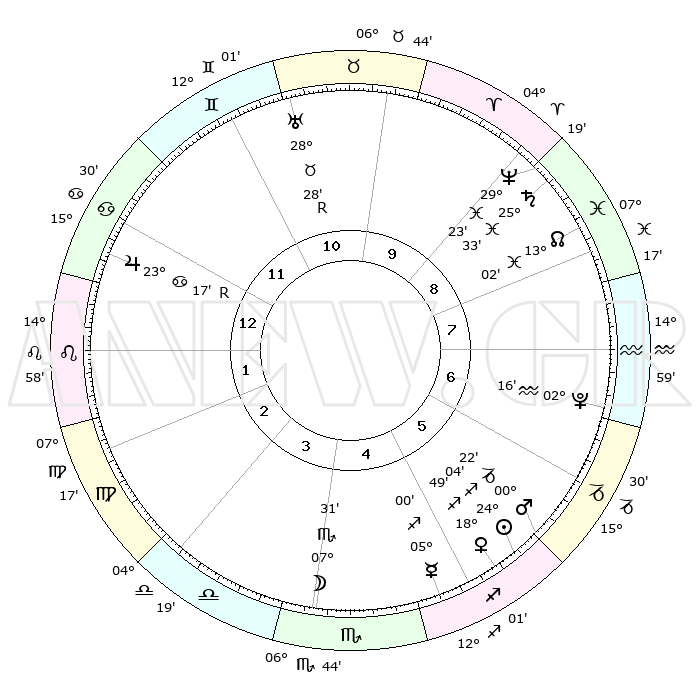 | | ΘΕΣΕΙΣ ΠΛΑΝΗΤΩΝ ΑΣΤΡΟΛΟΓΙΚΟΥ ΧΑΡΤΗ ΤΗΣ ΣΤΙΓΜΗΣ ΑΥΤΗΣ | | | | Πλανήτης | Ζώδιο | Μοίρες | Δεκαήμ. | Σε οίκο | Απόκλιση | | Ακμές των οίκων | | Ηλιος | Τοξότης | 23°01' | Τρίτο | 5 | 23 S 15 | | 1ος | 04°31' | Λέων | | Σελήνη | Ζυγός | 25°15' | Τρίτο | 4 | 12 S 54 | | 2ος | 25°53' | Λέων | | Ερμής | Τοξότης | 03°37' | Πρώτο | 5 | 19 S 20 | | 3ος | 21°33' | Παρθένος | | Αφροδίτη | Τοξότης | 17°31' | Δεύτερο | 5 | 22 S 41 | | 4ος | 23°06' | Ζυγός | | Αρης | Τοξότης | 29°35' | Τρίτο | 5 | 24 S 12 | | 5ος | 29°00' | Σκορπιός | | Δίας | Καρκίνος | 23°23'R | Τρίτο | 12 | 21 N 36 | | 6ος | 03°59' | Αιγόκερως | | Κρόνος | Ιχθείς | 25°32' | Τρίτο | 9 | 03 S 54 | | 7ος | 04°31' | Υδροχόος | | Ουρανός | Ταύρος | 28°30'R | Τρίτο | 10 | 19 N 37 | | 8ος | 25°53' | Υδροχόος | | Ποσειδώνας | Ιχθείς | 29°23' | Τρίτο | 9 | 01 S 29 | | 9ος | 21°33' | Ιχθείς | | Πλούτωνας | Υδροχόος | 02°14' | Πρώτο | 6 | 23 S 20 | | 10ος | 23°06' | Κριός | | Β. Δεσμός | Ιχθείς | 13°05' | Δεύτερο | 8 | 06 S 39 | | 11ος | 29°00' | Ταύρος | | Ωροσκόπος | Λέων | 04°31' | Πρώτο | | | 12ος | 03°59' | Καρκίνος | | Μεσουράνημα | Κριός | 23°06' | Τρίτο | | | |