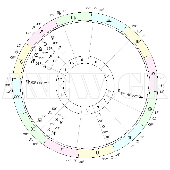| | ΘΕΣΕΙΣ ΠΛΑΝΗΤΩΝ ΑΣΤΡΟΛΟΓΙΚΟΥ ΧΑΡΤΗ ΤΗΣ ΣΤΙΓΜΗΣ ΑΥΤΗΣ | | | | Πλανήτης | Ζώδιο | Μοίρες | Δεκαήμ. | Σε οίκο | Απόκλιση | | Ακμές των οίκων | | Ηλιος | Τοξότης | 27°21' | Τρίτο | 3 | 23 S 24 | | 1ος | 24°30' | Ζυγός | | Σελήνη | Τοξότης | 15°50' | Δεύτερο | 2 | 27 S 39 | | 2ος | 22°35' | Σκορπιός | | Ερμής | Τοξότης | 09°28' | Πρώτο | 2 | 20 S 51 | | 3ος | 24°09' | Τοξότης | | Αφροδίτη | Τοξότης | 22°53' | Τρίτο | 2 | 23 S 14 | | 4ος | 27°59' | Αιγόκερως | | Αρης | Αιγόκερως | 02°49' | Πρώτο | 3 | 24 S 12 | | 5ος | 00°56' | Ιχθείς | | Δίας | Καρκίνος | 22°56'R | Τρίτο | 9 | 21 N 41 | | 6ος | 00°04' | Κριός | | Κρόνος | Ιχθείς | 25°40' | Τρίτο | 5 | 03 S 50 | | 7ος | 24°30' | Κριός | | Ουρανός | Ταύρος | 28°21'R | Τρίτο | 8 | 19 N 35 | | 8ος | 22°35' | Ταύρος | | Ποσειδώνας | Ιχθείς | 29°24' | Τρίτο | 5 | 01 S 28 | | 9ος | 24°09' | Δίδυμοι | | Πλούτωνας | Υδροχόος | 02°21' | Πρώτο | 4 | 23 S 18 | | 10ος | 27°59' | Καρκίνος | | Β. Δεσμός | Ιχθείς | 12°51' | Δεύτερο | 5 | 06 S 44 | | 11ος | 00°56' | Παρθένος | | Ωροσκόπος | Ζυγός | 24°30' | Τρίτο | | | 12ος | 00°04' | Ζυγός | | Μεσουράνημα | Καρκίνος | 27°59' | Τρίτο | | | |