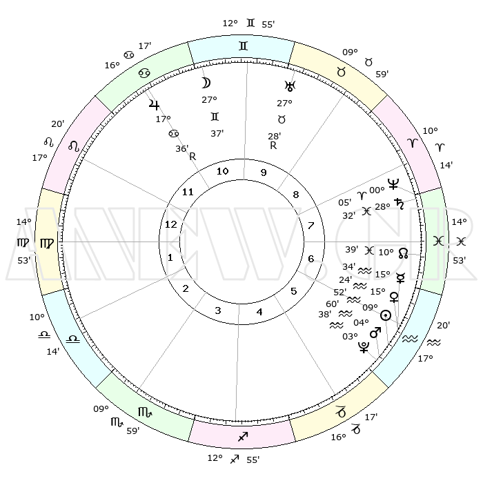 | | ΘΕΣΕΙΣ ΠΛΑΝΗΤΩΝ ΑΣΤΡΟΛΟΓΙΚΟΥ ΧΑΡΤΗ ΤΗΣ ΣΤΙΓΜΗΣ ΑΥΤΗΣ | | | | Πλανήτης | Ζώδιο | Μοίρες | Δεκαήμ. | Σε οίκο | Απόκλιση | | Ακμές των οίκων | | Ηλιος | Υδροχόος | 09°48' | Πρώτο | 6 | 17 S 47 | | 1ος | 24°25' | Λέων | | Σελήνη | Δίδυμοι | 26°36' | Τρίτο | 11 | 28 N 21 | | 2ος | 17°41' | Παρθένος | | Ερμής | Υδροχόος | 15°27' | Δεύτερο | 6 | 18 S 06 | | 3ος | 15°48' | Ζυγός | | Αφροδίτη | Υδροχόος | 15°18' | Δεύτερο | 6 | 17 S 30 | | 4ος | 18°37' | Σκορπιός | | Αρης | Υδροχόος | 04°57' | Πρώτο | 6 | 20 S 02 | | 5ος | 23°12' | Τοξότης | | Δίας | Καρκίνος | 17°37'R | Δεύτερο | 11 | 22 N 34 | | 6ος | 25°39' | Αιγόκερως | | Κρόνος | Ιχθείς | 28°32' | Τρίτο | 8 | 02 S 35 | | 7ος | 24°25' | Υδροχόος | | Ουρανός | Ταύρος | 27°28'R | Τρίτο | 10 | 19 N 24 | | 8ος | 17°41' | Ιχθείς | | Ποσειδώνας | Κριός | 00°05' | Πρώτο | 8 | 01 S 11 | | 9ος | 15°48' | Κριός | | Πλούτωνας | Υδροχόος | 03°38' | Πρώτο | 6 | 23 S 02 | | 10ος | 18°37' | Ταύρος | | Β. Δεσμός | Ιχθείς | 10°39' | Δεύτερο | 7 | 07 S 34 | | 11ος | 23°12' | Δίδυμοι | | Ωροσκόπος | Λέων | 24°25' | Τρίτο | | | 12ος | 25°39' | Καρκίνος | | Μεσουράνημα | Ταύρος | 18°37' | Δεύτερο | | | |