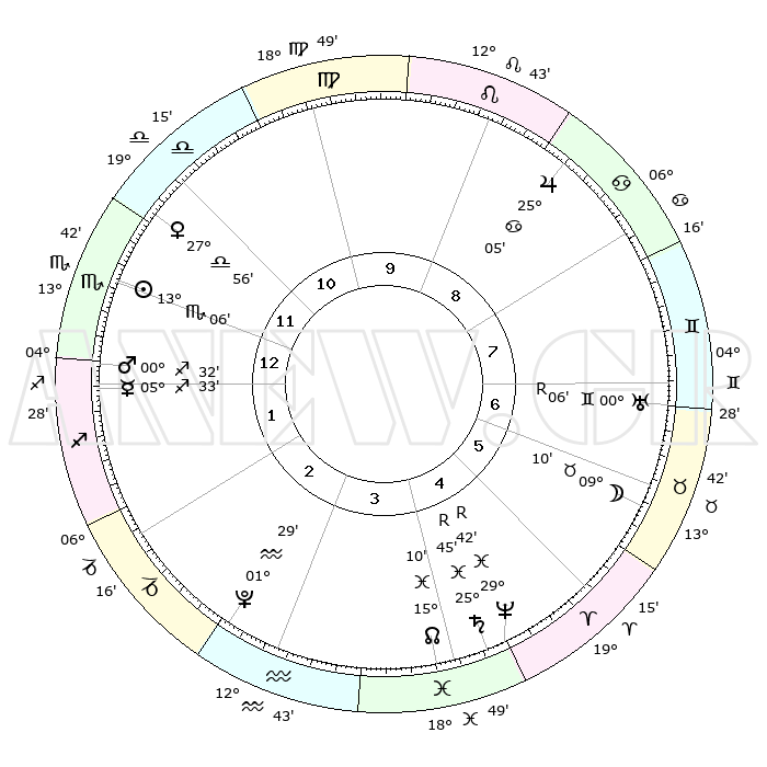 | | ΘΕΣΕΙΣ ΠΛΑΝΗΤΩΝ ΑΣΤΡΟΛΟΓΙΚΟΥ ΧΑΡΤΗ ΤΗΣ ΣΤΙΓΜΗΣ ΑΥΤΗΣ | | | | Πλανήτης | Ζώδιο | Μοίρες | Δεκαήμ. | Σε οίκο | Απόκλιση | | Ακμές των οίκων | | Ηλιος | Σκορπιός | 12°57' | Δεύτερο | 1 | 15 S 43 | | 1ος | 19°01' | Ζυγός | | Σελήνη | Ταύρος | 06°47' | Πρώτο | 7 | 17 N 27 | | 2ος | 16°48' | Σκορπιός | | Ερμής | Τοξότης | 05°27' | Πρώτο | 2 | 23 S 58 | | 3ος | 18°02' | Τοξότης | | Αφροδίτη | Ζυγός | 27°44' | Τρίτο | 1 | 09 S 21 | | 4ος | 21°34' | Αιγόκερως | | Αρης | Τοξότης | 00°26' | Πρώτο | 2 | 20 S 39 | | 5ος | 24°31' | Υδροχόος | | Δίας | Καρκίνος | 25°05' | Τρίτο | 10 | 21 N 12 | | 6ος | 24°02' | Ιχθείς | | Κρόνος | Ιχθείς | 25°45'R | Τρίτο | 6 | 03 S 57 | | 7ος | 19°01' | Κριός | | Ουρανός | Δίδυμοι | 00°07'R | Πρώτο | 8 | 19 N 58 | | 8ος | 16°48' | Ταύρος | | Ποσειδώνας | Ιχθείς | 29°43'R | Τρίτο | 6 | 01 S 22 | | 9ος | 18°02' | Δίδυμοι | | Πλούτωνας | Υδροχόος | 01°29' | Πρώτο | 4 | 23 S 30 | | 10ος | 21°34' | Καρκίνος | | Β. Δεσμός | Ιχθείς | 15°11' | Δεύτερο | 5 | 05 S 50 | | 11ος | 24°31' | Λέων | | Ωροσκόπος | Ζυγός | 19°01' | Δεύτερο | | | 12ος | 24°02' | Παρθένος | | Μεσουράνημα | Καρκίνος | 21°34' | Τρίτο | | | |