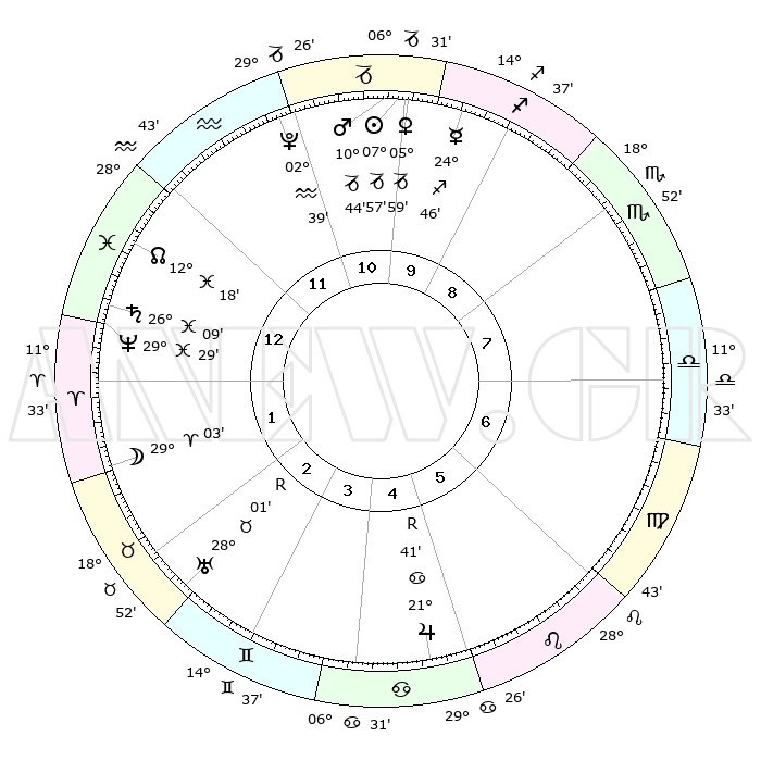 | | ΘΕΣΕΙΣ ΠΛΑΝΗΤΩΝ ΑΣΤΡΟΛΟΓΙΚΟΥ ΧΑΡΤΗ ΤΗΣ ΣΤΙΓΜΗΣ ΑΥΤΗΣ | | | | Πλανήτης | Ζώδιο | Μοίρες | Δεκαήμ. | Σε οίκο | Απόκλιση | | Ακμές των οίκων | | Ηλιος | Αιγόκερως | 07°53' | Πρώτο | 11 | 23 S 12 | | 1ος | 28°04' | Υδροχόος | | Σελήνη | Κριός | 27°58' | Τρίτο | 2 | 14 N 12 | | 2ος | 13°37' | Κριός | | Ερμής | Τοξότης | 24°39' | Τρίτο | 10 | 23 S 36 | | 3ος | 16°43' | Ταύρος | | Αφροδίτη | Αιγόκερως | 05°53' | Πρώτο | 11 | 23 S 42 | | 4ος | 11°19' | Δίδυμοι | | Αρης | Αιγόκερως | 10°40' | Δεύτερο | 11 | 23 S 53 | | 5ος | 03°01' | Καρκίνος | | Δίας | Καρκίνος | 21°42'R | Τρίτο | 5 | 21 N 55 | | 6ος | 26°22' | Καρκίνος | | Κρόνος | Ιχθείς | 26°08' | Τρίτο | 1 | 03 S 37 | | 7ος | 28°04' | Λέων | | Ουρανός | Ταύρος | 28°01'R | Τρίτο | 3 | 19 N 31 | | 8ος | 13°37' | Ζυγός | | Ποσειδώνας | Ιχθείς | 29°29' | Τρίτο | 1 | 01 S 26 | | 9ος | 16°43' | Σκορπιός | | Πλούτωνας | Υδροχόος | 02°39' | Πρώτο | 12 | 23 S 14 | | 10ος | 11°19' | Τοξότης | | Β. Δεσμός | Ιχθείς | 12°19' | Δεύτερο | 1 | 06 S 56 | | 11ος | 03°01' | Αιγόκερως | | Ωροσκόπος | Υδροχόος | 28°04' | Τρίτο | | | 12ος | 26°22' | Αιγόκερως | | Μεσουράνημα | Τοξότης | 11°19' | Δεύτερο | | | |