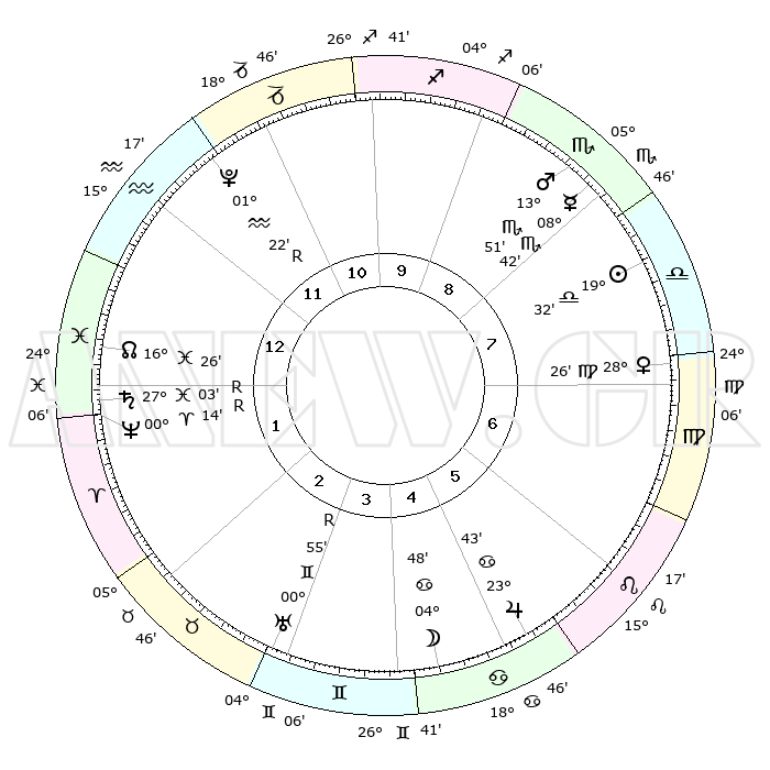 | ΘΕΣΕΙΣ ΠΛΑΝΗΤΩΝ ΑΣΤΡΟΛΟΓΙΚΟΥ ΧΑΡΤΗ ΤΗΣ ΣΤΙΓΜΗΣ ΑΥΤΗΣ | | Πλανήτης | Ζώδιο | Μοίρες | Δεκαήμ. | Σε οίκο | Απόκλιση | | Ακμές των οίκων | Ηλιος | Ζυγός | 19°26' | Δεύτερο | 8 | 07 S 36 | | 1ος | 02°02' | Υδροχόος | Σελήνη | Καρκίνος | 03°23' | Πρώτο | 5 | 28 N 25 | | 2ος | 16°28' | Ιχθείς | Ερμής | Σκορπιός | 08°34' | Πρώτο | 9 | 15 S 44 | | 3ος | 24°35' | Κριός | Αφροδίτη | Παρθένος | 28°18' | Τρίτο | 8 | 02 N 02 | | 4ος | 22°42' | Ταύρος | Αρης | Σκορπιός | 13°47' | Δεύτερο | 9 | 16 S 10 | | 5ος | 15°19' | Δίδυμοι | Δίας | Καρκίνος | 23°42' | Τρίτο | 6 | 21 N 24 | | 6ος | 06°48' | Καρκίνος | Κρόνος | Ιχθείς | 27°03'R | Τρίτο | 2 | 03 S 28 | | 7ος | 02°02' | Λέων | Ουρανός | Δίδυμοι | 00°56'R | Πρώτο | 4 | 20 N 08 | | 8ος | 16°28' | Παρθένος | Ποσειδώνας | Κριός | 00°14'R | Πρώτο | 2 | 01 S 10 | | 9ος | 24°35' | Ζυγός | Πλούτωνας | Υδροχόος | 01°22'R | Πρώτο | 12 | 23 S 32 | | 10ος | 22°42' | Σκορπιός | Β. Δεσμός | Ιχθείς | 16°26' | Δεύτερο | 1 | 05 S 21 | | 11ος | 15°19' | Τοξότης | Ωροσκόπος | Υδροχόος | 02°02' | Πρώτο | | | 12ος | 06°48' | Αιγόκερως | Μεσουράνημα | Σκορπιός | 22°42' | Τρίτο | | | |