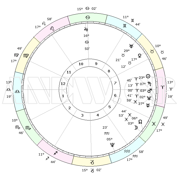 | | ΘΕΣΕΙΣ ΠΛΑΝΗΤΩΝ ΑΣΤΡΟΛΟΓΙΚΟΥ ΧΑΡΤΗ ΤΗΣ ΣΤΙΓΜΗΣ ΑΥΤΗΣ | | | | Πλανήτης | Ζώδιο | Μοίρες | Δεκαήμ. | Σε οίκο | Απόκλιση | | Ακμές των οίκων | | Ηλιος | Κριός | 23°41' | Τρίτο | 8 | 09 N 12 | | 1ος | 24°54' | Παρθένος | | Σελήνη | Ιχθείς | 03°03' | Πρώτο | 6 | 10 S 49 | | 2ος | 21°06' | Ζυγός | | Ερμής | Ιχθείς | 27°53' | Τρίτο | 7 | 03 S 10 | | 3ος | 21°20' | Σκορπιός | | Αφροδίτη | Ταύρος | 17°08' | Δεύτερο | 8 | 17 N 03 | | 4ος | 24°16' | Τοξότης | | Αρης | Κριός | 02°57' | Πρώτο | 7 | 00 N 16 | | 5ος | 27°20' | Αιγόκερως | | Δίας | Καρκίνος | 16°49' | Δεύτερο | 10 | 22 N 45 | | 6ος | 27°57' | Υδροχόος | | Κρόνος | Κριός | 07°13' | Πρώτο | 7 | 00 N 54 | | 7ος | 24°54' | Ιχθείς | | Ουρανός | Ταύρος | 29°21' | Τρίτο | 9 | 19 N 51 | | 8ος | 21°06' | Κριός | | Ποσειδώνας | Κριός | 02°40' | Πρώτο | 7 | 00 S 08 | | 9ος | 21°20' | Ταύρος | | Πλούτωνας | Υδροχόος | 05°23' | Πρώτο | 5 | 22 S 47 | | 10ος | 24°16' | Δίδυμοι | | Β. Δεσμός | Ιχθείς | 06°44' | Πρώτο | 6 | 09 S 02 | | 11ος | 27°20' | Καρκίνος | | Ωροσκόπος | Παρθένος | 24°54' | Τρίτο | | | 12ος | 27°57' | Λέων | | Μεσουράνημα | Δίδυμοι | 24°16' | Τρίτο | | | |