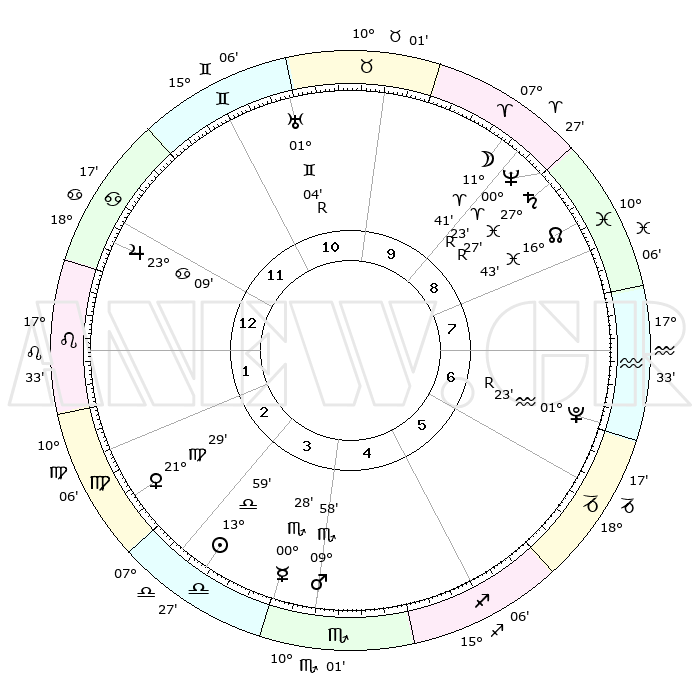 | ΘΕΣΕΙΣ ΠΛΑΝΗΤΩΝ ΑΣΤΡΟΛΟΓΙΚΟΥ ΧΑΡΤΗ ΤΗΣ ΣΤΙΓΜΗΣ ΑΥΤΗΣ | | Πλανήτης | Ζώδιο | Μοίρες | Δεκαήμ. | Σε οίκο | Απόκλιση | | Ακμές των οίκων | Ηλιος | Ζυγός | 13°54' | Δεύτερο | 4 | 05 S 29 | | 1ος | 23°16' | Καρκίνος | Σελήνη | Κριός | 10°27' | Δεύτερο | 10 | 05 N 57 | | 2ος | 13°55' | Λέων | Ερμής | Σκορπιός | 00°20' | Πρώτο | 4 | 12 S 21 | | 3ος | 08°04' | Παρθένος | Αφροδίτη | Παρθένος | 21°22' | Τρίτο | 3 | 04 N 43 | | 4ος | 08°11' | Ζυγός | Αρης | Σκορπιός | 09°55' | Πρώτο | 4 | 14 S 55 | | 5ος | 14°16' | Σκορπιός | Δίας | Καρκίνος | 23°09' | Τρίτο | 12 | 21 N 29 | | 6ος | 21°06' | Τοξότης | Κρόνος | Ιχθείς | 27°27'R | Τρίτο | 9 | 03 S 19 | | 7ος | 23°16' | Αιγόκερως | Ουρανός | Δίδυμοι | 01°04'R | Πρώτο | 11 | 20 N 10 | | 8ος | 13°55' | Υδροχόος | Ποσειδώνας | Κριός | 00°23'R | Πρώτο | 9 | 01 S 06 | | 9ος | 08°04' | Ιχθείς | Πλούτωνας | Υδροχόος | 01°23'R | Πρώτο | 7 | 23 S 32 | | 10ος | 08°11' | Κριός | Β. Δεσμός | Ιχθείς | 16°44' | Δεύτερο | 9 | 05 S 14 | | 11ος | 14°16' | Ταύρος | Ωροσκόπος | Καρκίνος | 23°16' | Τρίτο | | | 12ος | 21°06' | Δίδυμοι | Μεσουράνημα | Κριός | 08°11' | Πρώτο | | | |