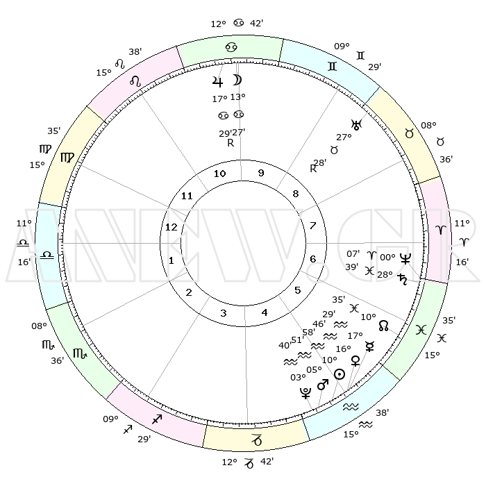 | | ΘΕΣΕΙΣ ΠΛΑΝΗΤΩΝ ΑΣΤΡΟΛΟΓΙΚΟΥ ΧΑΡΤΗ ΤΗΣ ΣΤΙΓΜΗΣ ΑΥΤΗΣ | | | | Πλανήτης | Ζώδιο | Μοίρες | Δεκαήμ. | Σε οίκο | Απόκλιση | | Ακμές των οίκων | | Ηλιος | Υδροχόος | 10°55' | Δεύτερο | 5 | 17 S 29 | | 1ος | 24°29' | Παρθένος | | Σελήνη | Καρκίνος | 12°37' | Δεύτερο | 10 | 27 N 10 | | 2ος | 20°39' | Ζυγός | | Ερμής | Υδροχόος | 17°23' | Δεύτερο | 5 | 17 S 29 | | 3ος | 20°52' | Σκορπιός | | Αφροδίτη | Υδροχόος | 16°41' | Δεύτερο | 5 | 17 S 07 | | 4ος | 23°48' | Τοξότης | | Αρης | Υδροχόος | 05°48' | Πρώτο | 5 | 19 S 49 | | 5ος | 26°52' | Αιγόκερως | | Δίας | Καρκίνος | 17°29'R | Δεύτερο | 10 | 22 N 35 | | 6ος | 27°31' | Υδροχόος | | Κρόνος | Ιχθείς | 28°38' | Τρίτο | 7 | 02 S 32 | | 7ος | 24°29' | Ιχθείς | | Ουρανός | Ταύρος | 27°28'R | Τρίτο | 9 | 19 N 24 | | 8ος | 20°39' | Κριός | | Ποσειδώνας | Κριός | 00°07' | Πρώτο | 7 | 01 S 10 | | 9ος | 20°52' | Ταύρος | | Πλούτωνας | Υδροχόος | 03°40' | Πρώτο | 5 | 23 S 02 | | 10ος | 23°48' | Δίδυμοι | | Β. Δεσμός | Ιχθείς | 10°35' | Δεύτερο | 6 | 07 S 36 | | 11ος | 26°52' | Καρκίνος | | Ωροσκόπος | Παρθένος | 24°29' | Τρίτο | | | 12ος | 27°31' | Λέων | | Μεσουράνημα | Δίδυμοι | 23°48' | Τρίτο | | | |