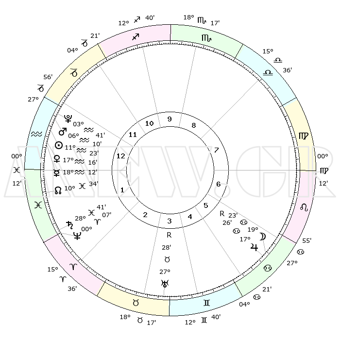 | | ΘΕΣΕΙΣ ΠΛΑΝΗΤΩΝ ΑΣΤΡΟΛΟΓΙΚΟΥ ΧΑΡΤΗ ΤΗΣ ΣΤΙΓΜΗΣ ΑΥΤΗΣ | | | | Πλανήτης | Ζώδιο | Μοίρες | Δεκαήμ. | Σε οίκο | Απόκλιση | | Ακμές των οίκων | | Ηλιος | Υδροχόος | 11°18' | Δεύτερο | 1 | 17 S 23 | | 1ος | 22°55' | Αιγόκερως | | Σελήνη | Καρκίνος | 18°13' | Δεύτερο | 6 | 26 N 12 | | 2ος | 05°41' | Ιχθείς | | Ερμής | Υδροχόος | 18°03' | Δεύτερο | 1 | 17 S 15 | | 3ος | 15°06' | Κριός | | Αφροδίτη | Υδροχόος | 17°10' | Δεύτερο | 1 | 16 S 58 | | 4ος | 14°50' | Ταύρος | | Αρης | Υδροχόος | 06°06' | Πρώτο | 1 | 19 S 45 | | 5ος | 08°12' | Δίδυμοι | | Δίας | Καρκίνος | 17°27'R | Δεύτερο | 6 | 22 N 36 | | 6ος | 29°26' | Δίδυμοι | | Κρόνος | Ιχθείς | 28°41' | Τρίτο | 2 | 02 S 31 | | 7ος | 22°55' | Καρκίνος | | Ουρανός | Ταύρος | 27°28'R | Τρίτο | 4 | 19 N 24 | | 8ος | 05°41' | Παρθένος | | Ποσειδώνας | Κριός | 00°07' | Πρώτο | 2 | 01 S 10 | | 9ος | 15°06' | Ζυγός | | Πλούτωνας | Υδροχόος | 03°41' | Πρώτο | 1 | 23 S 02 | | 10ος | 14°50' | Σκορπιός | | Β. Δεσμός | Ιχθείς | 10°34' | Δεύτερο | 2 | 07 S 36 | | 11ος | 08°12' | Τοξότης | | Ωροσκόπος | Αιγόκερως | 22°55' | Τρίτο | | | 12ος | 29°26' | Τοξότης | | Μεσουράνημα | Σκορπιός | 14°50' | Δεύτερο | | | |