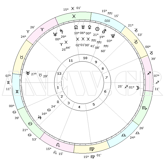 | | ΘΕΣΕΙΣ ΠΛΑΝΗΤΩΝ ΑΣΤΡΟΛΟΓΙΚΟΥ ΧΑΡΤΗ ΤΗΣ ΣΤΙΓΜΗΣ ΑΥΤΗΣ | | | | Πλανήτης | Ζώδιο | Μοίρες | Δεκαήμ. | Σε οίκο | Απόκλιση | | Ακμές των οίκων | | Ηλιος | Υδροχόος | 21°37' | Τρίτο | 11 | 14 S 18 | | 1ος | 09°02' | Ταύρος | | Σελήνη | Τοξότης | 00°41' | Πρώτο | 7 | 25 S 22 | | 2ος | 08°48' | Δίδυμοι | | Ερμής | Ιχθείς | 05°54' | Πρώτο | 11 | 10 S 08 | | 3ος | 01°31' | Καρκίνος | | Αφροδίτη | Υδροχόος | 29°56' | Τρίτο | 11 | 12 S 51 | | 4ος | 23°19' | Καρκίνος | | Αρης | Υδροχόος | 14°05' | Δεύτερο | 10 | 17 S 37 | | 5ος | 18°42' | Λέων | | Δίας | Καρκίνος | 16°25'R | Δεύτερο | 3 | 22 N 45 | | 6ος | 23°13' | Παρθένος | | Κρόνος | Ιχθείς | 29°43' | Τρίτο | 12 | 02 S 05 | | 7ος | 09°02' | Σκορπιός | | Ουρανός | Ταύρος | 27°29' | Τρίτο | 1 | 19 N 25 | | 8ος | 08°48' | Τοξότης | | Ποσειδώνας | Κριός | 00°25' | Πρώτο | 12 | 01 S 02 | | 9ος | 01°31' | Αιγόκερως | | Πλούτωνας | Υδροχόος | 03°60' | Πρώτο | 10 | 22 S 58 | | 10ος | 23°19' | Αιγόκερως | | Β. Δεσμός | Ιχθείς | 10°02' | Δεύτερο | 11 | 07 S 48 | | 11ος | 18°42' | Υδροχόος | | Ωροσκόπος | Ταύρος | 09°02' | Πρώτο | | | 12ος | 23°13' | Ιχθείς | | Μεσουράνημα | Αιγόκερως | 23°19' | Τρίτο | | | |