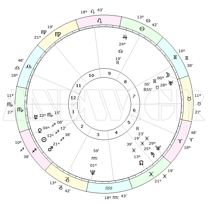 | | ΘΕΣΕΙΣ ΠΛΑΝΗΤΩΝ ΑΣΤΡΟΛΟΓΙΚΟΥ ΧΑΡΤΗ ΤΗΣ ΣΤΙΓΜΗΣ ΑΥΤΗΣ | | | | Πλανήτης | Ζώδιο | Μοίρες | Δεκαήμ. | Σε οίκο | Απόκλιση | | Ακμές των οίκων | | Ηλιος | Τοξότης | 12°10' | Δεύτερο | 2 | 22 S 15 | | 1ος | 29°58' | Ζυγός | | Σελήνη | Ταύρος | 29°29' | Τρίτο | 8 | 24 N 46 | | 2ος | 28°23' | Σκορπιός | | Ερμής | Σκορπιός | 22°13' | Τρίτο | 1 | 15 S 50 | | 3ος | 00°20' | Αιγόκερως | | Αφροδίτη | Τοξότης | 04°05' | Πρώτο | 2 | 20 S 23 | | 4ος | 04°31' | Υδροχόος | | Αρης | Τοξότης | 21°36' | Τρίτο | 2 | 23 S 51 | | 5ος | 07°26' | Ιχθείς | | Δίας | Καρκίνος | 24°19'R | Τρίτο | 9 | 21 N 25 | | 6ος | 06°07' | Κριός | | Κρόνος | Ιχθείς | 25°19' | Τρίτο | 5 | 04 S 02 | | 7ος | 29°58' | Κριός | | Ουρανός | Ταύρος | 28°55'R | Τρίτο | 8 | 19 N 43 | | 8ος | 28°23' | Ταύρος | | Ποσειδώνας | Ιχθείς | 29°23'R | Τρίτο | 5 | 01 S 29 | | 9ος | 00°20' | Καρκίνος | | Πλούτωνας | Υδροχόος | 01°58' | Πρώτο | 3 | 23 S 23 | | 10ος | 04°31' | Λέων | | Β. Δεσμός | Ιχθείς | 13°39' | Δεύτερο | 5 | 06 S 26 | | 11ος | 07°26' | Παρθένος | | Ωροσκόπος | Ζυγός | 29°58' | Τρίτο | | | 12ος | 06°07' | Ζυγός | | Μεσουράνημα | Λέων | 04°31' | Πρώτο | | | |