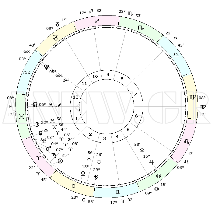 | | ΘΕΣΕΙΣ ΠΛΑΝΗΤΩΝ ΑΣΤΡΟΛΟΓΙΚΟΥ ΧΑΡΤΗ ΤΗΣ ΣΤΙΓΜΗΣ ΑΥΤΗΣ | | | | Πλανήτης | Ζώδιο | Μοίρες | Δεκαήμ. | Σε οίκο | Απόκλιση | | Ακμές των οίκων | | Ηλιος | Κριός | 25°04' | Τρίτο | 2 | 09 N 42 | | 1ος | 06°46' | Υδροχόος | | Σελήνη | Ιχθείς | 22°07' | Τρίτο | 2 | 01 S 59 | | 2ος | 21°49' | Ιχθείς | | Ερμής | Ιχθείς | 29°50' | Τρίτο | 2 | 02 S 26 | | 3ος | 29°06' | Κριός | | Αφροδίτη | Ταύρος | 18°51' | Δεύτερο | 3 | 17 N 35 | | 4ος | 26°27' | Ταύρος | | Αρης | Κριός | 04°03' | Πρώτο | 2 | 00 N 43 | | 5ος | 18°47' | Δίδυμοι | | Δίας | Καρκίνος | 16°58' | Δεύτερο | 6 | 22 N 44 | | 6ος | 10°30' | Καρκίνος | | Κρόνος | Κριός | 07°23' | Πρώτο | 2 | 00 N 58 | | 7ος | 06°46' | Λέων | | Ουρανός | Ταύρος | 29°25' | Τρίτο | 4 | 19 N 51 | | 8ος | 21°49' | Παρθένος | | Ποσειδώνας | Κριός | 02°43' | Πρώτο | 2 | 00 S 07 | | 9ος | 29°06' | Ζυγός | | Πλούτωνας | Υδροχόος | 05°24' | Πρώτο | 12 | 22 S 47 | | 10ος | 26°27' | Σκορπιός | | Β. Δεσμός | Ιχθείς | 06°40' | Πρώτο | 1 | 09 S 04 | | 11ος | 18°47' | Τοξότης | | Ωροσκόπος | Υδροχόος | 06°46' | Πρώτο | | | 12ος | 10°30' | Αιγόκερως | | Μεσουράνημα | Σκορπιός | 26°27' | Τρίτο | | | |