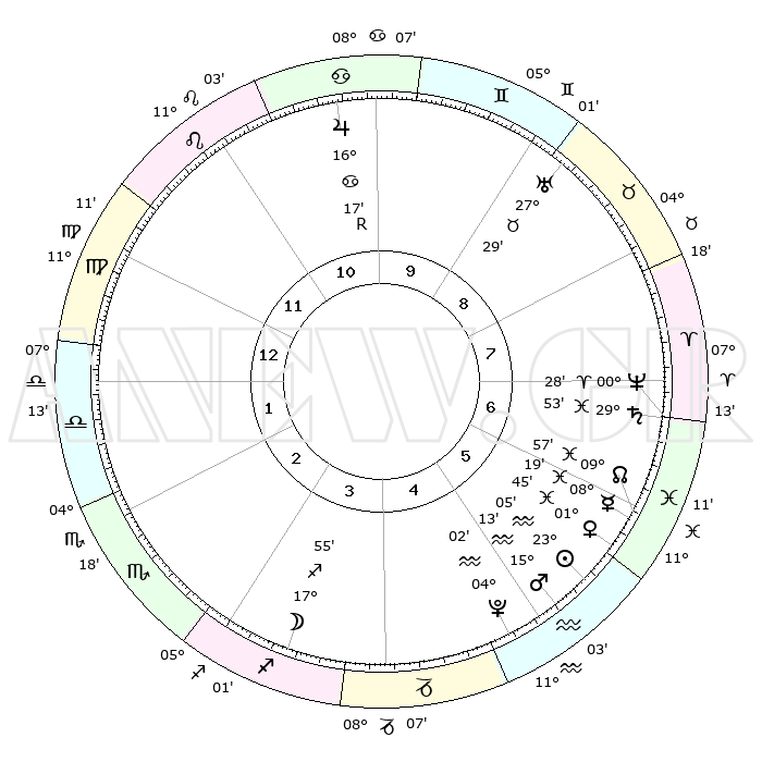 | | ΘΕΣΕΙΣ ΠΛΑΝΗΤΩΝ ΑΣΤΡΟΛΟΓΙΚΟΥ ΧΑΡΤΗ ΤΗΣ ΣΤΙΓΜΗΣ ΑΥΤΗΣ | | | | Πλανήτης | Ζώδιο | Μοίρες | Δεκαήμ. | Σε οίκο | Απόκλιση | | Ακμές των οίκων | | Ηλιος | Υδροχόος | 23°01' | Τρίτο | 6 | 13 S 51 | | 1ος | 15°19' | Παρθένος | | Σελήνη | Τοξότης | 17°02' | Δεύτερο | 4 | 27 S 59 | | 2ος | 10°42' | Ζυγός | | Ερμής | Ιχθείς | 08°12' | Πρώτο | 6 | 09 S 03 | | 3ος | 10°28' | Σκορπιός | | Αφροδίτη | Ιχθείς | 01°39' | Πρώτο | 6 | 12 S 15 | | 4ος | 13°25' | Τοξότης | | Αρης | Υδροχόος | 15°10' | Δεύτερο | 5 | 17 S 19 | | 5ος | 16°46' | Αιγόκερως | | Δίας | Καρκίνος | 16°17'R | Δεύτερο | 10 | 22 N 46 | | 6ος | 17°47' | Υδροχόος | | Κρόνος | Ιχθείς | 29°52' | Τρίτο | 7 | 02 S 02 | | 7ος | 15°19' | Ιχθείς | | Ουρανός | Ταύρος | 27°29' | Τρίτο | 9 | 19 N 25 | | 8ος | 10°42' | Κριός | | Ποσειδώνας | Κριός | 00°28' | Πρώτο | 7 | 01 S 01 | | 9ος | 10°28' | Ταύρος | | Πλούτωνας | Υδροχόος | 04°02' | Πρώτο | 5 | 22 S 58 | | 10ος | 13°25' | Δίδυμοι | | Β. Δεσμός | Ιχθείς | 09°58' | Πρώτο | 6 | 07 S 50 | | 11ος | 16°46' | Καρκίνος | | Ωροσκόπος | Παρθένος | 15°19' | Δεύτερο | | | 12ος | 17°47' | Λέων | | Μεσουράνημα | Δίδυμοι | 13°25' | Δεύτερο | | | |