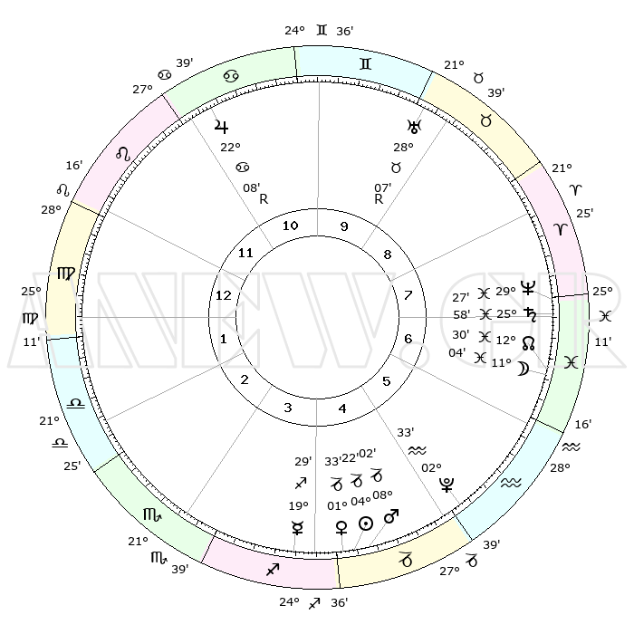 | | ΘΕΣΕΙΣ ΠΛΑΝΗΤΩΝ ΑΣΤΡΟΛΟΓΙΚΟΥ ΧΑΡΤΗ ΤΗΣ ΣΤΙΓΜΗΣ ΑΥΤΗΣ | | | | Πλανήτης | Ζώδιο | Μοίρες | Δεκαήμ. | Σε οίκο | Απόκλιση | | Ακμές των οίκων | | Ηλιος | Αιγόκερως | 04°17' | Πρώτο | 5 | 23 S 22 | | 1ος | 03°23' | Παρθένος | | Σελήνη | Ιχθείς | 10°06' | Δεύτερο | 7 | 07 S 52 | | 2ος | 27°35' | Παρθένος | | Ερμής | Τοξότης | 19°22' | Δεύτερο | 4 | 22 S 51 | | 3ος | 26°33' | Ζυγός | | Αφροδίτη | Αιγόκερως | 01°27' | Πρώτο | 4 | 23 S 42 | | 4ος | 29°30' | Σκορπιός | | Αρης | Αιγόκερως | 07°59' | Πρώτο | 5 | 24 S 03 | | 5ος | 03°28' | Αιγόκερως | | Δίας | Καρκίνος | 22°08'R | Τρίτο | 11 | 21 N 50 | | 6ος | 05°10' | Υδροχόος | | Κρόνος | Ιχθείς | 25°57' | Τρίτο | 7 | 03 S 42 | | 7ος | 03°23' | Ιχθείς | | Ουρανός | Ταύρος | 28°08'R | Τρίτο | 9 | 19 N 33 | | 8ος | 27°35' | Ιχθείς | | Ποσειδώνας | Ιχθείς | 29°27' | Τρίτο | 8 | 01 S 27 | | 9ος | 26°33' | Κριός | | Πλούτωνας | Υδροχόος | 02°32' | Πρώτο | 5 | 23 S 15 | | 10ος | 29°30' | Ταύρος | | Β. Δεσμός | Ιχθείς | 12°30' | Δεύτερο | 7 | 06 S 52 | | 11ος | 03°28' | Καρκίνος | | Ωροσκόπος | Παρθένος | 03°23' | Πρώτο | | | 12ος | 05°10' | Λέων | | Μεσουράνημα | Ταύρος | 29°30' | Τρίτο | | | |